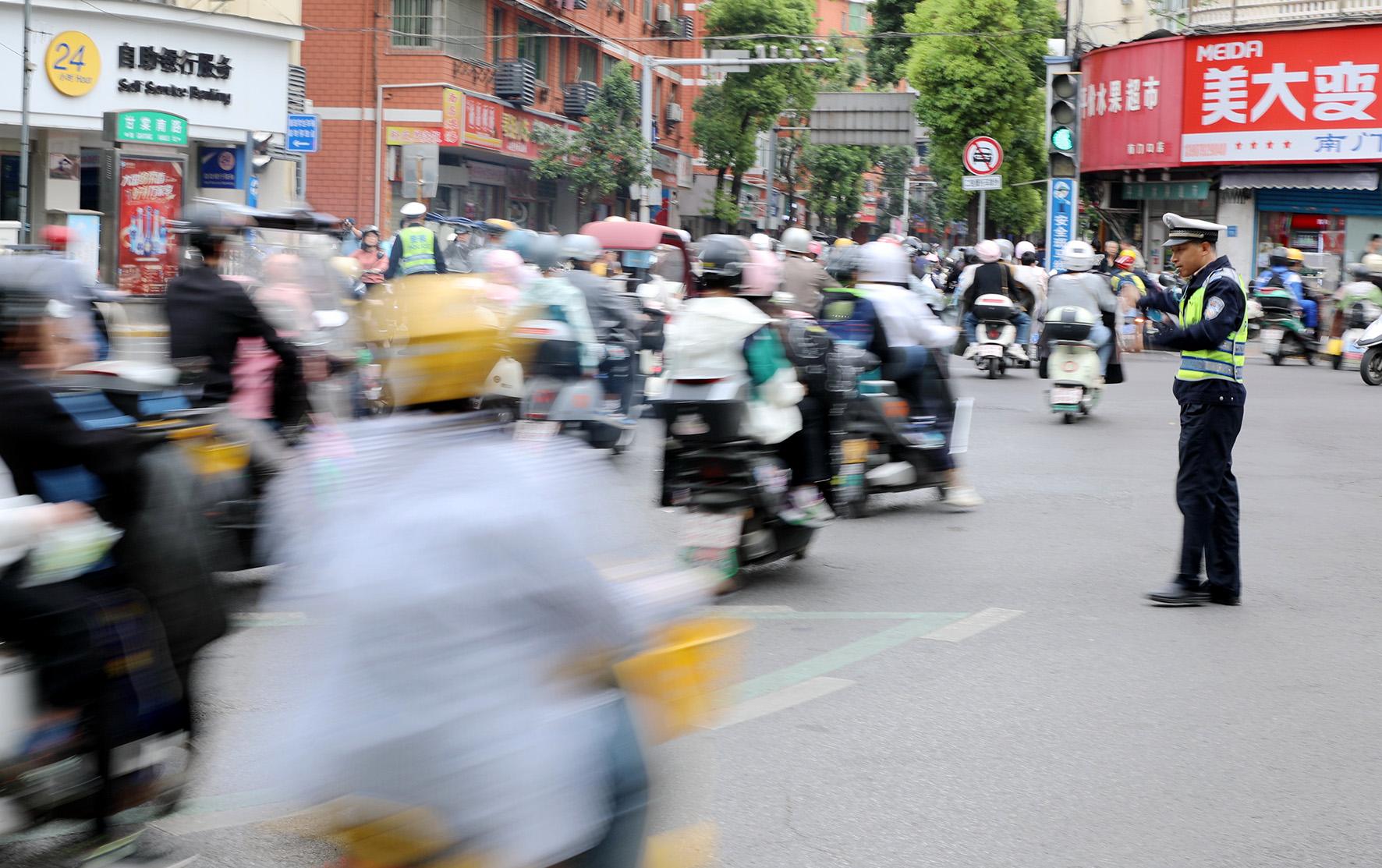 4月17日,江西省九江市公安局交管支隊第一大隊“護學(xué)崗”民警輔警在上學(xué)、放學(xué)交通高峰堅守崗位,確保師生交通安全。