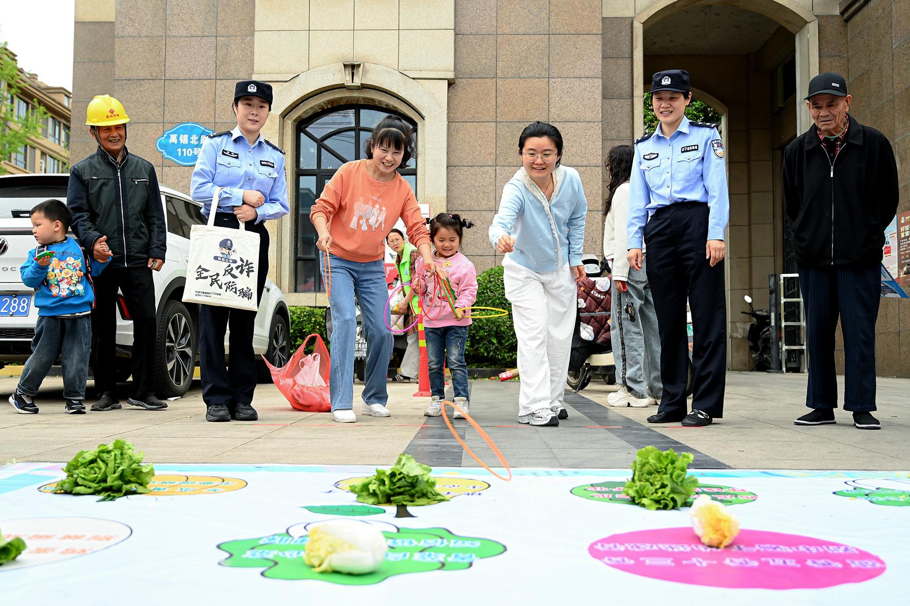 圖為群眾在印有“詐騙套路”的地墊上進行有獎套圈活動。