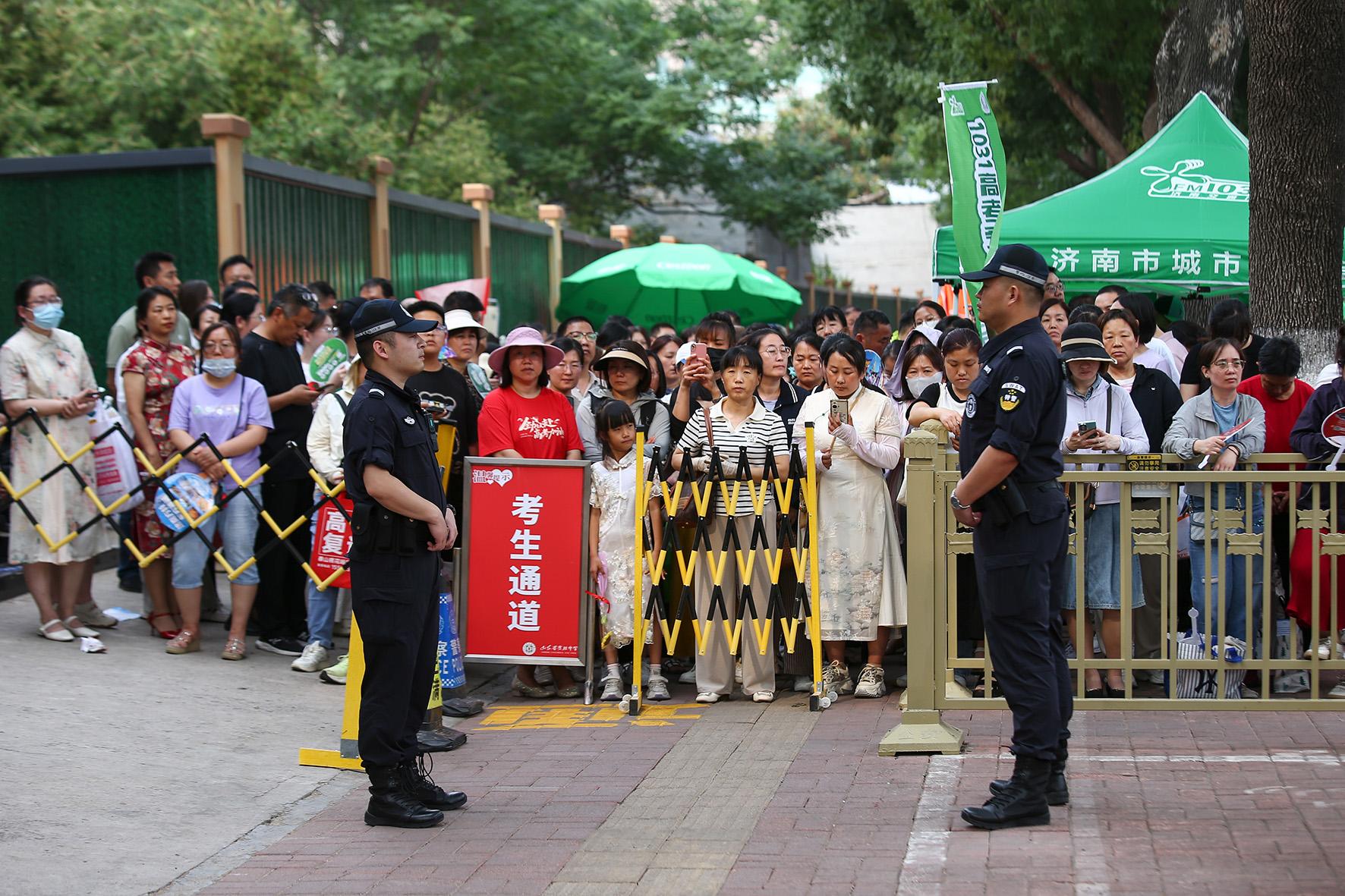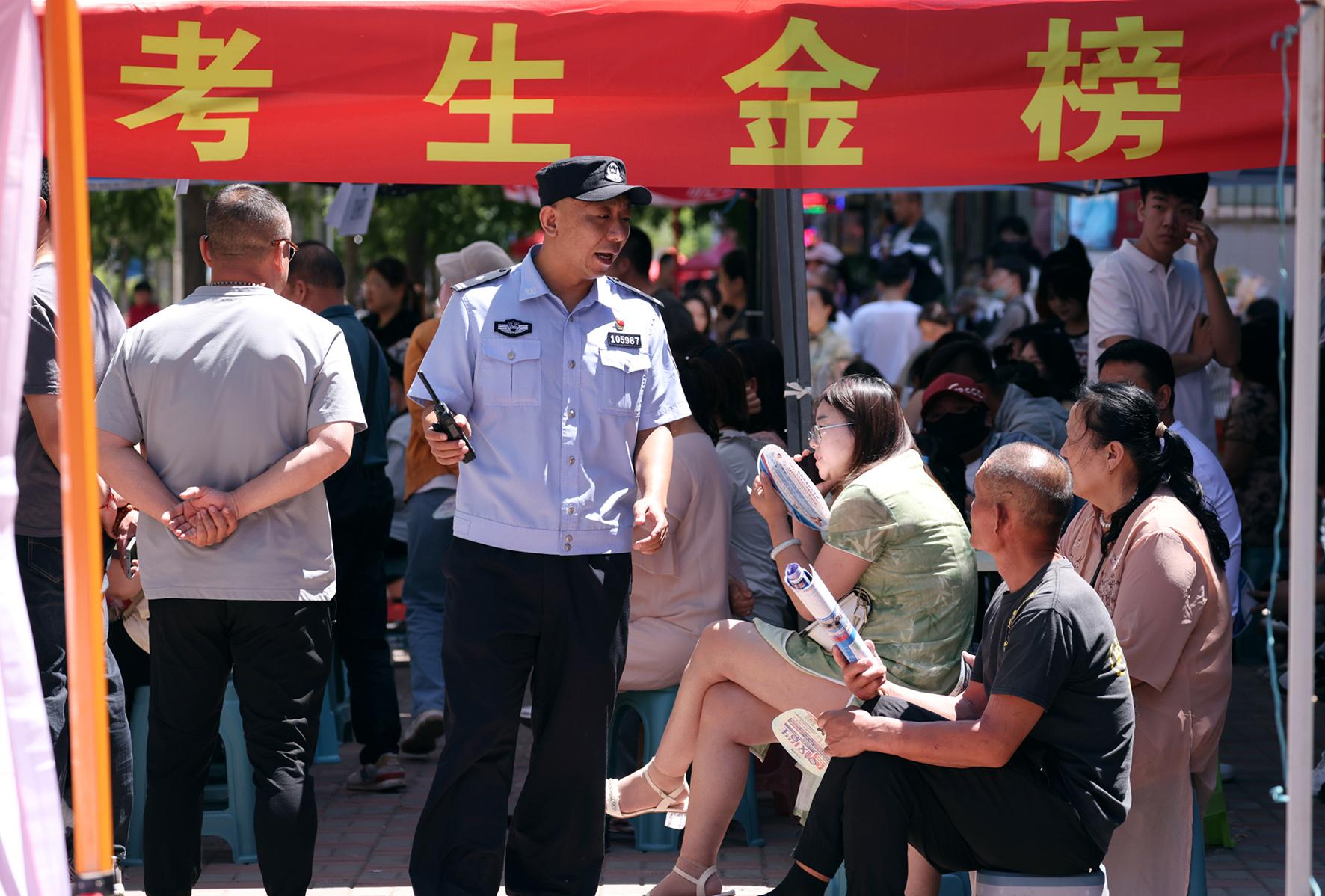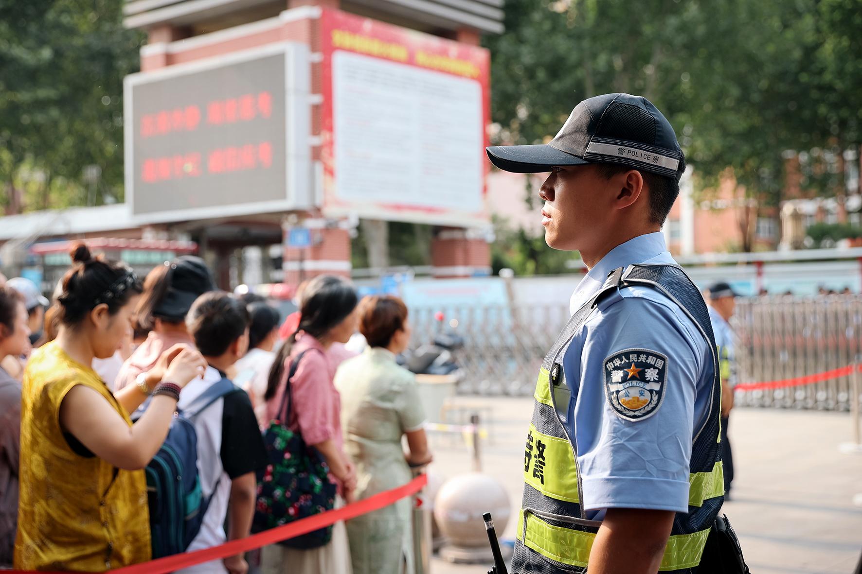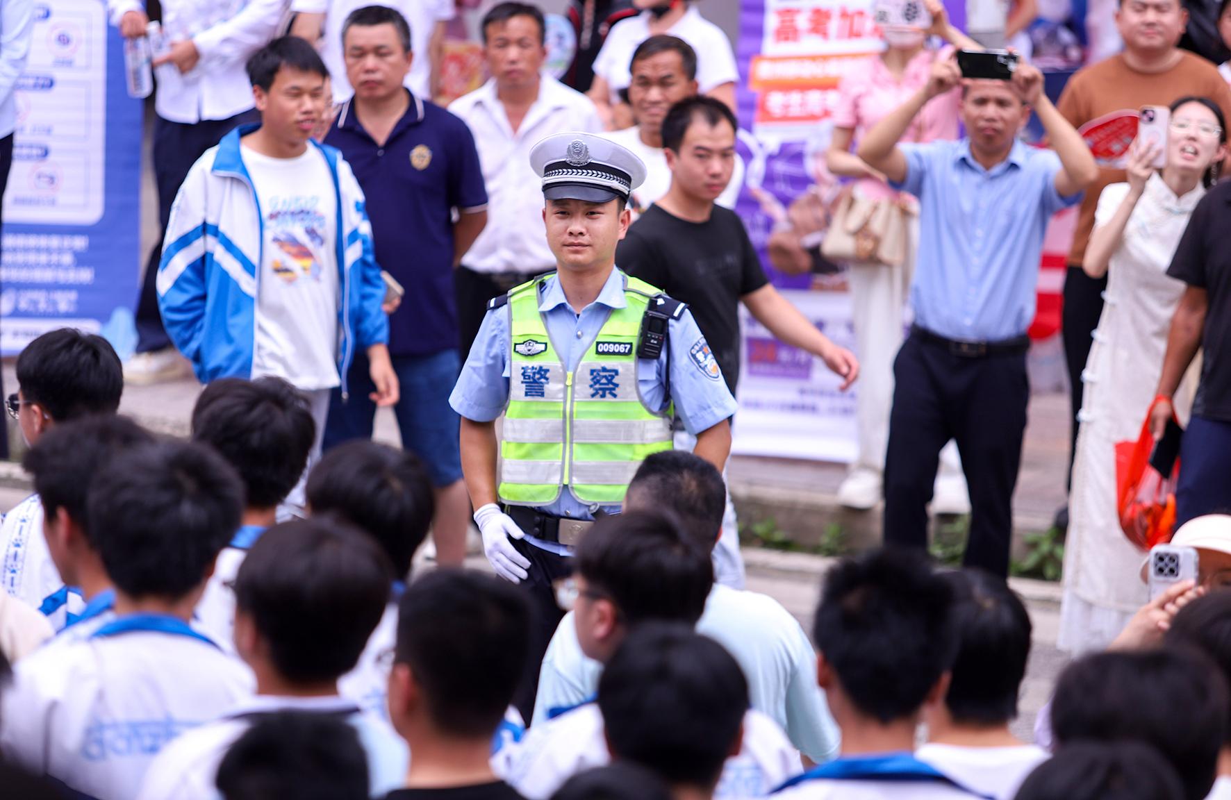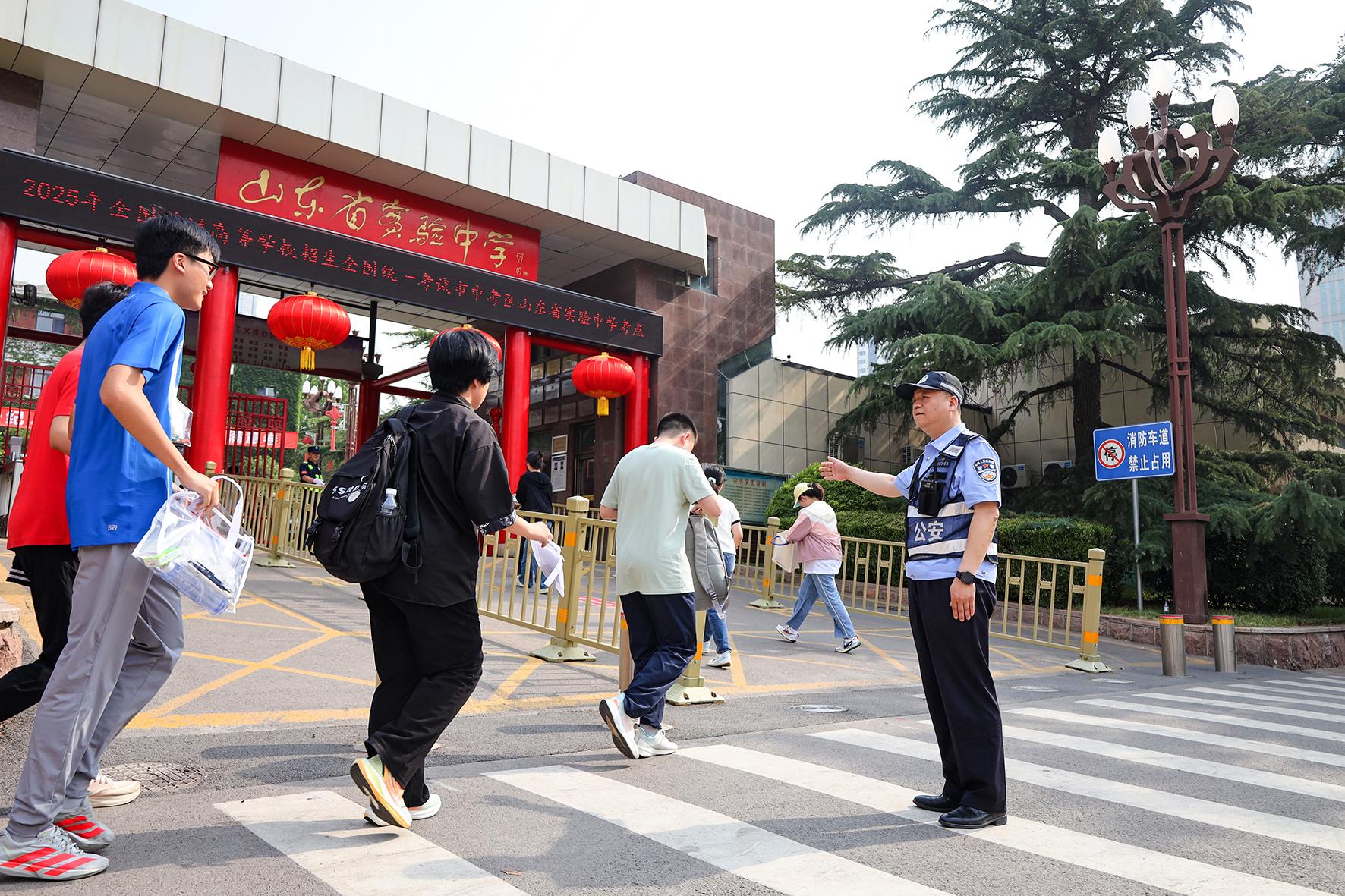 6月7日,在山東省實驗中學(xué)考點,濟南市公安局市中區(qū)分局桿石橋派出所執(zhí)勤民警引導(dǎo)考生有序進場。