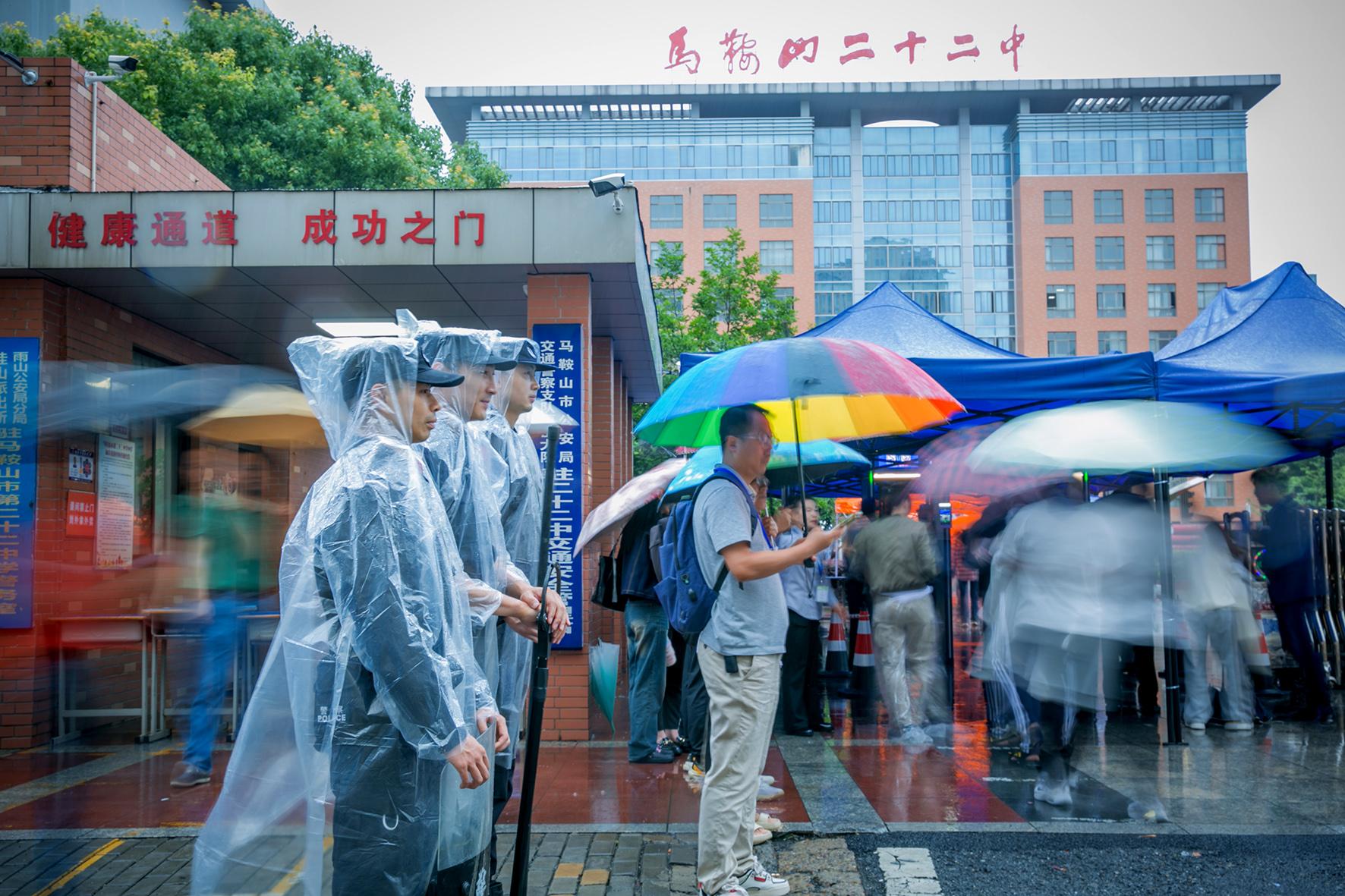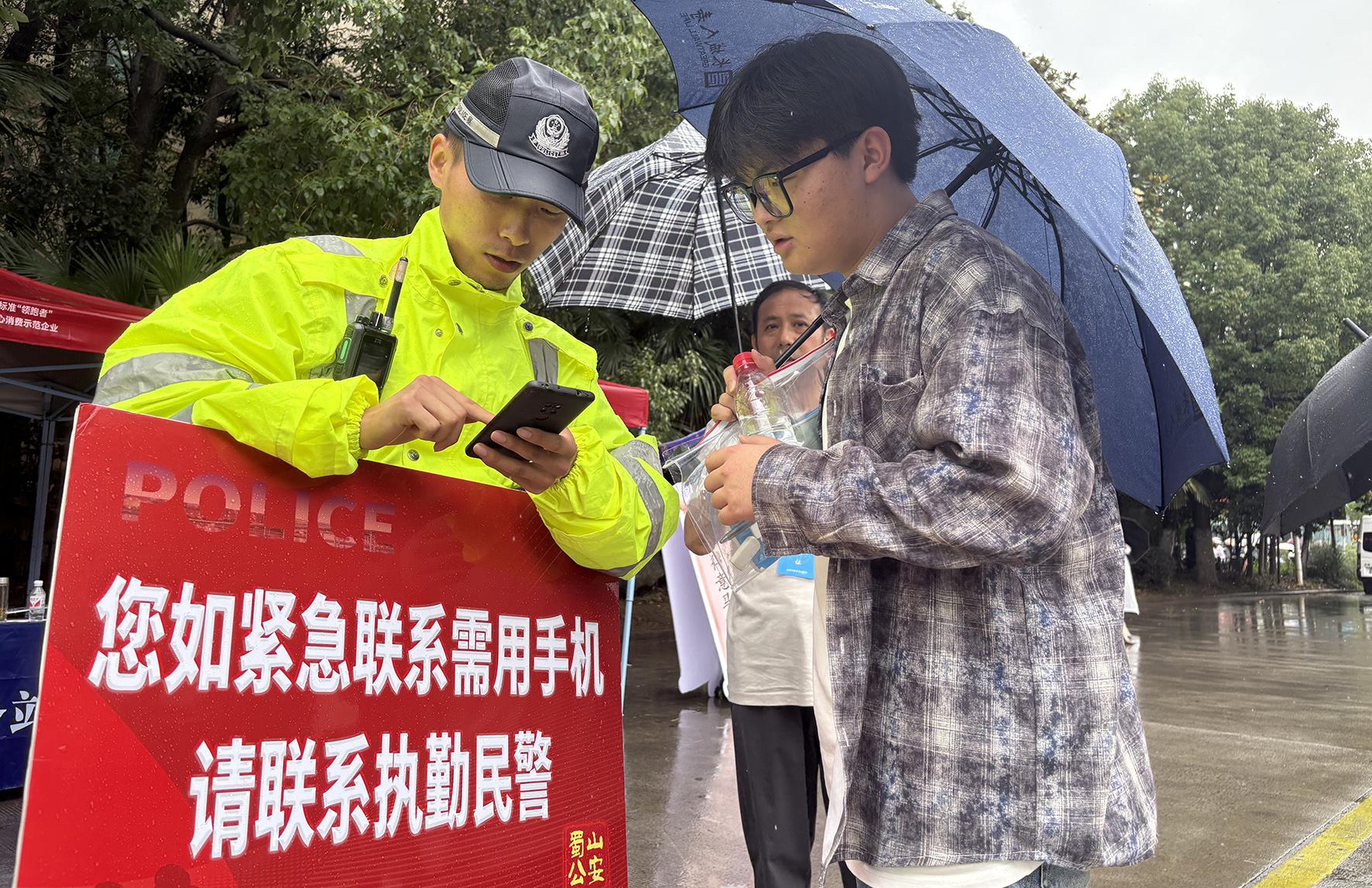 6月7日,安徽省馬鞍山市公安局雨山分局民警在考點外頂風(fēng)冒雨,全力維護考點周邊秩序。