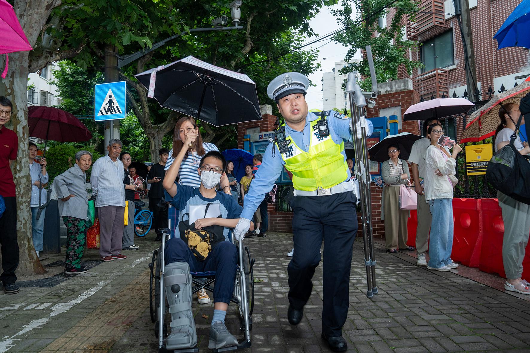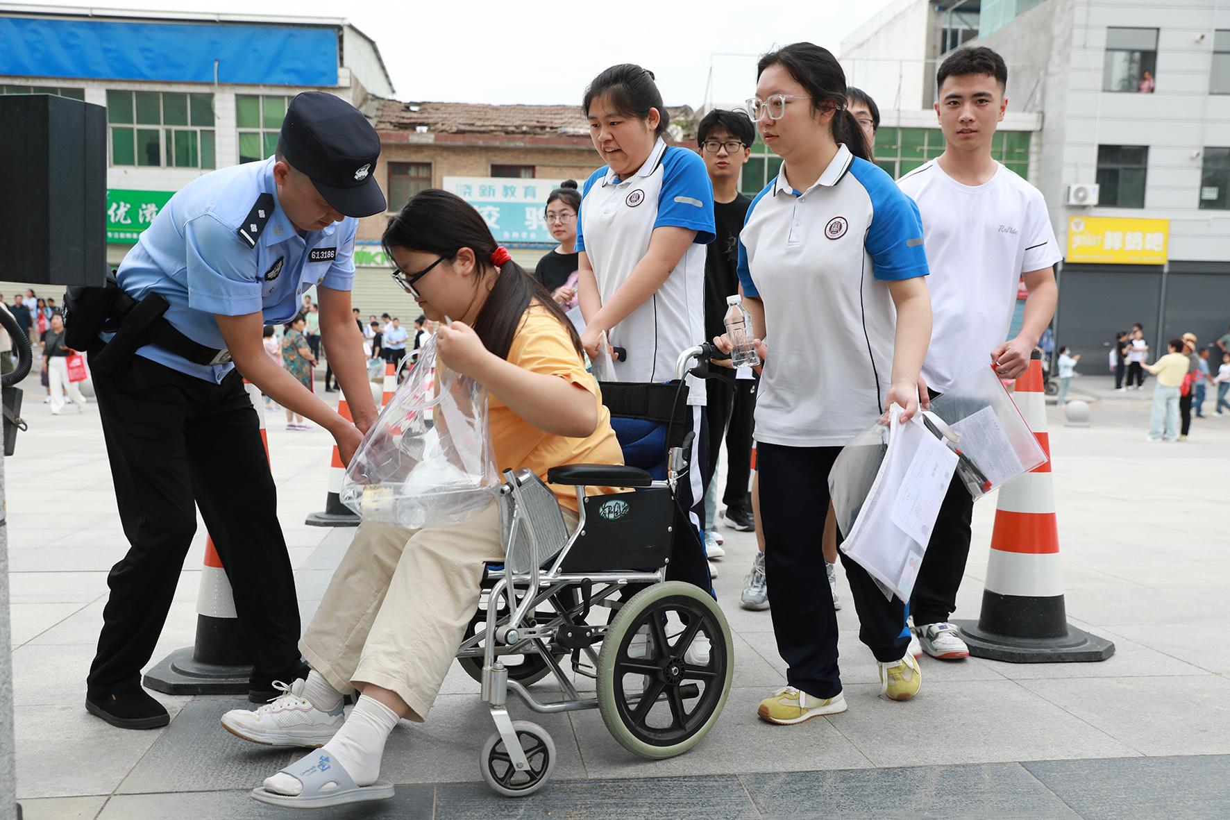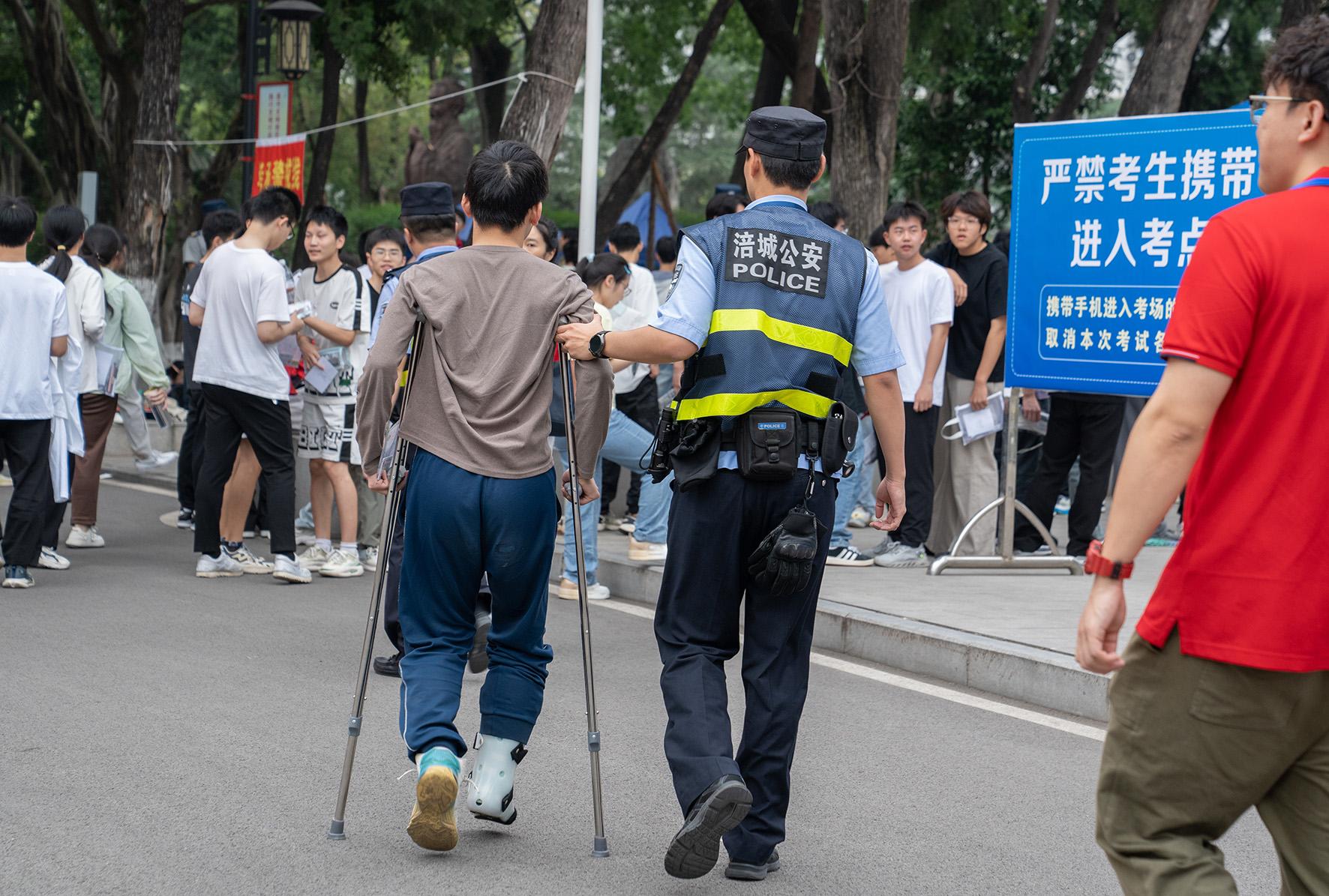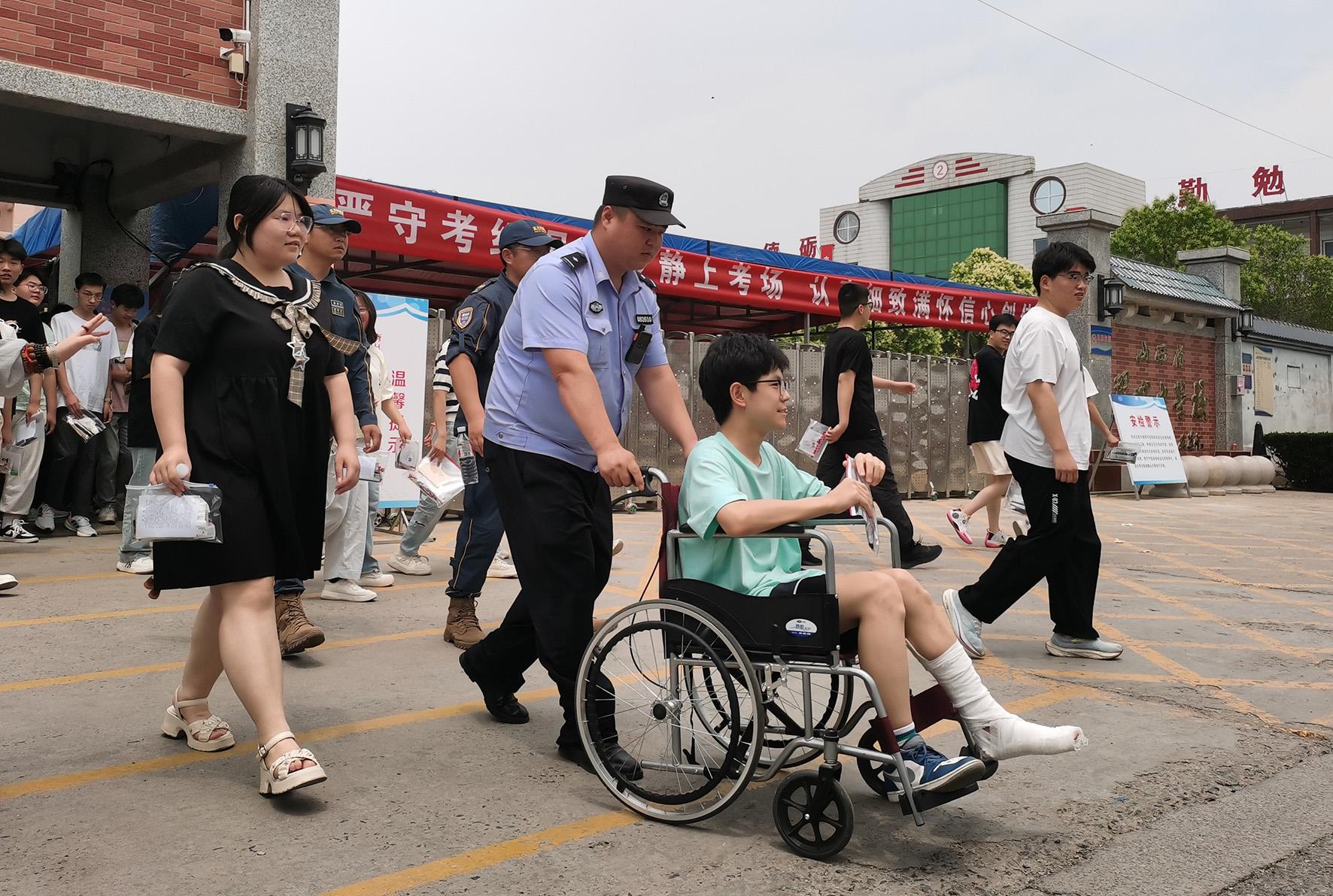 6月7日,陜西省富平縣公安局執(zhí)勤民輔警正在幫助受傷考生進入考場。