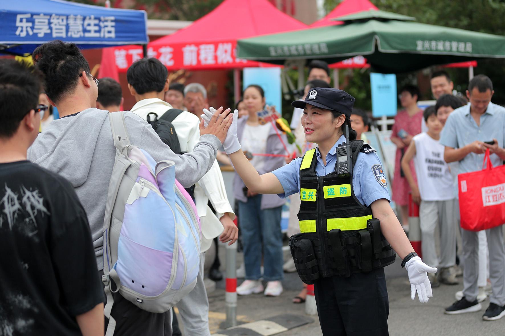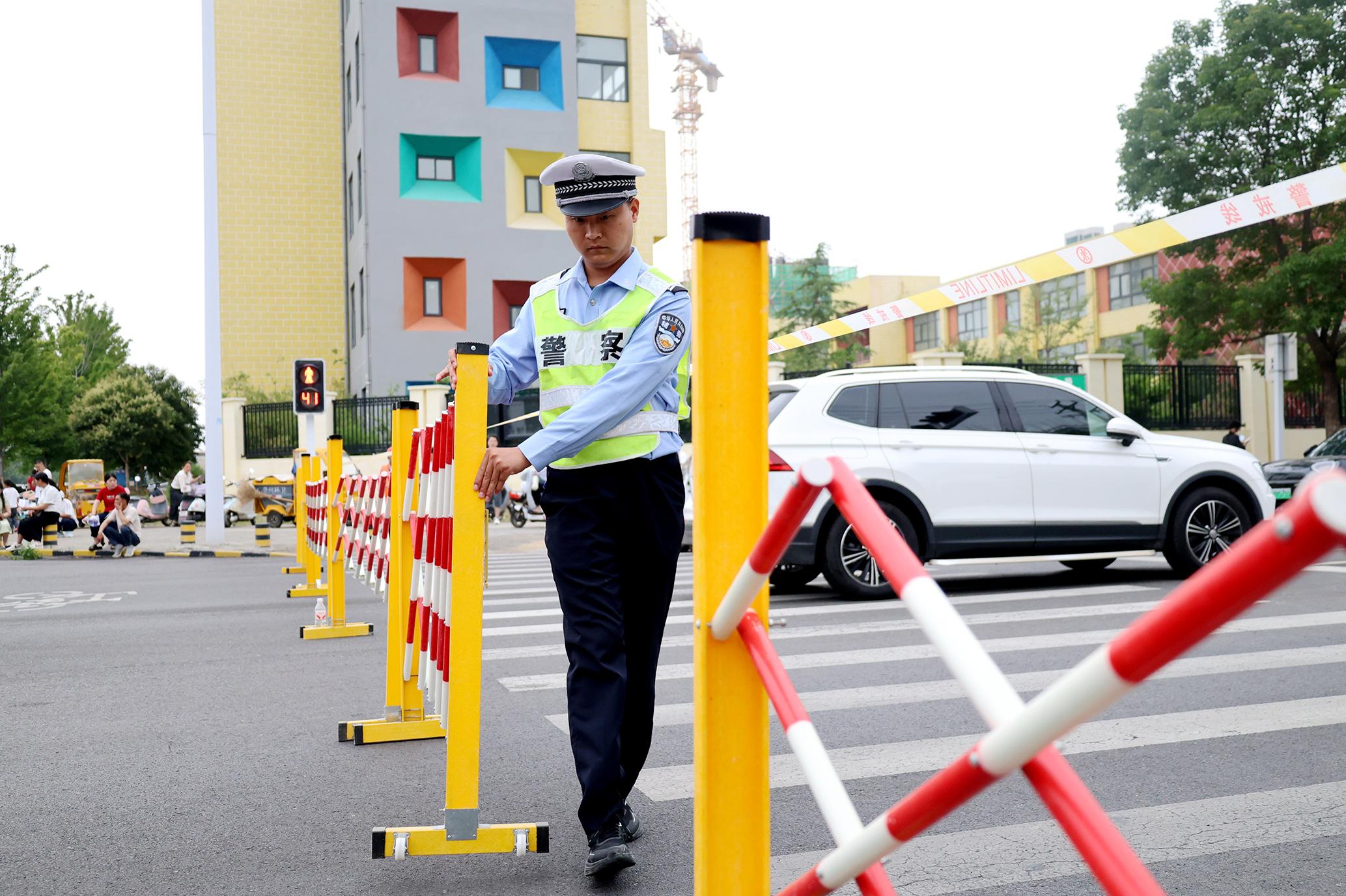 6月7日,江蘇省宜興市公安局環(huán)科園派出所社區(qū)民警在宜興市第二高級中學(xué)考點為考生護航加油。