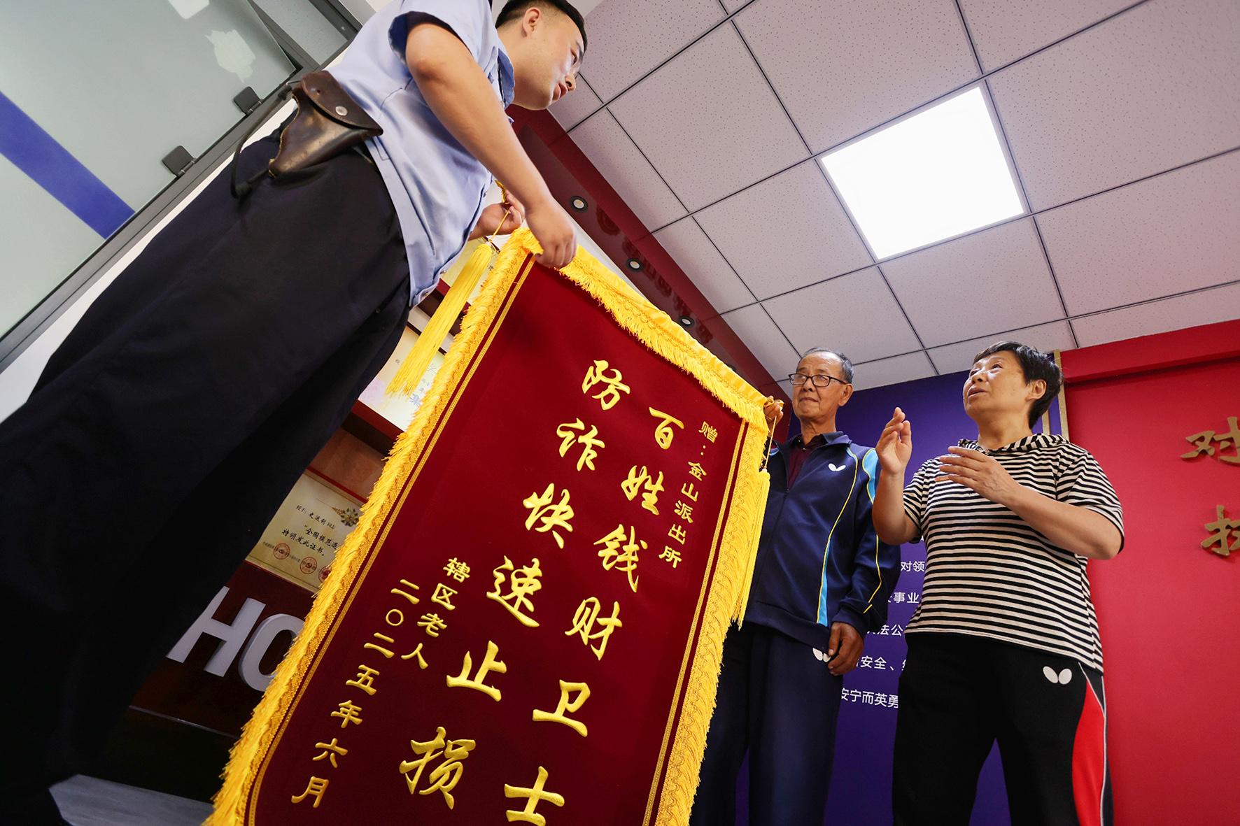 6月16日,一對老年夫妻來到遼寧省本溪市公安局明山分局金山派出所,將精心制作的錦旗送到民警手中,感謝民警及時幫助老人識破騙局,保住了養(yǎng)老救命錢。