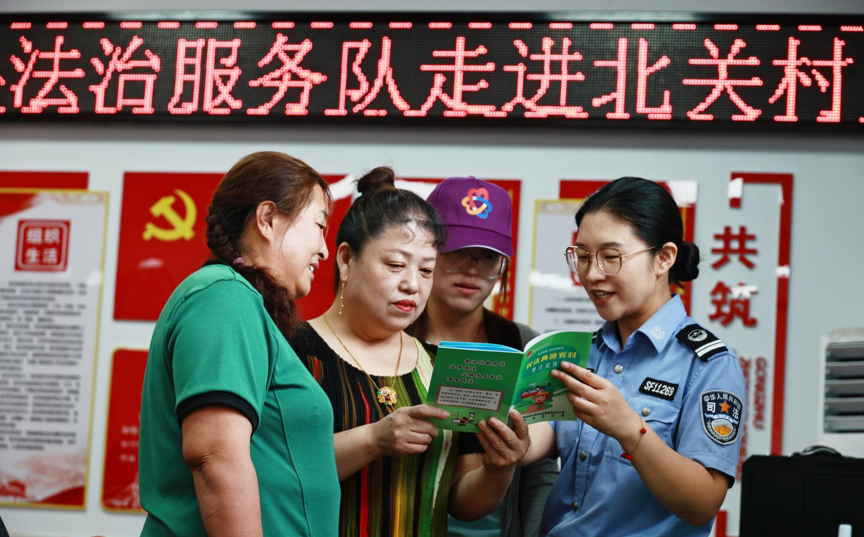 圖為法治服務隊隊員在龍興鎮(zhèn)北關村為群眾解讀法律問題。