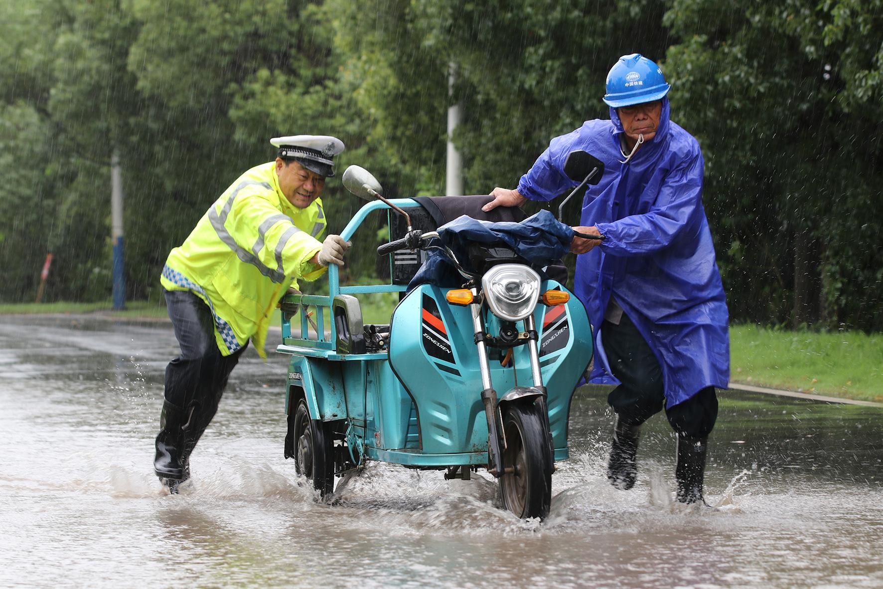 圖為民警在二壩鎮(zhèn)長(zhǎng)江路幫助村民將故障三輪車(chē)推出積水路面。