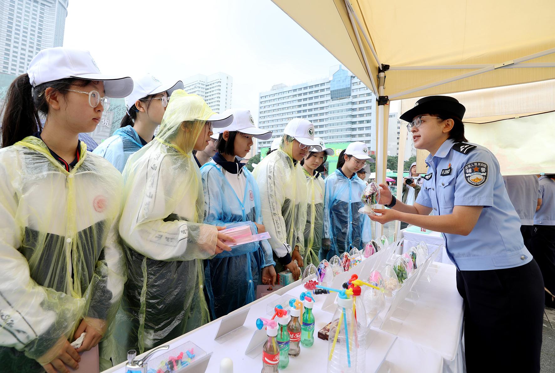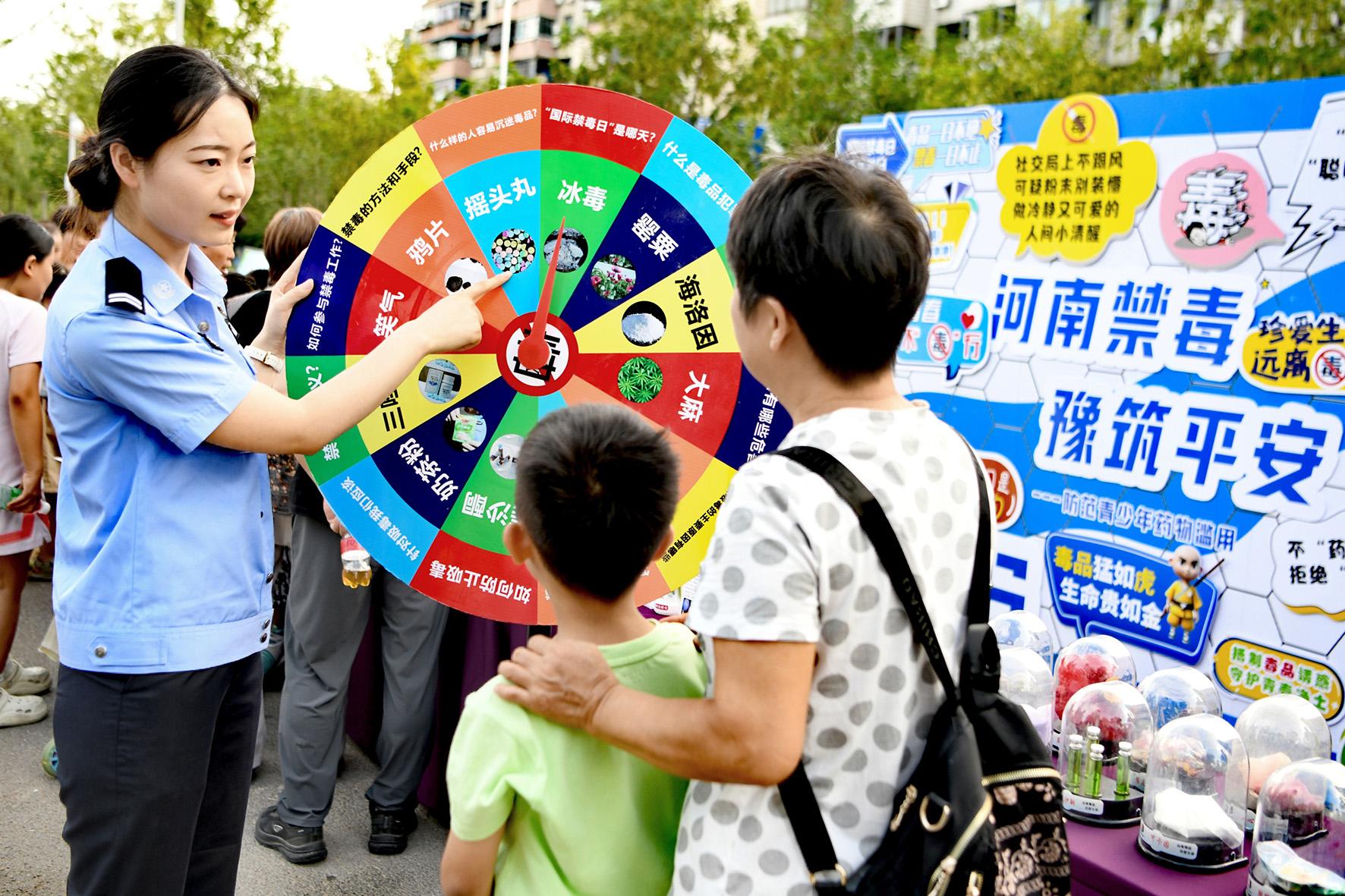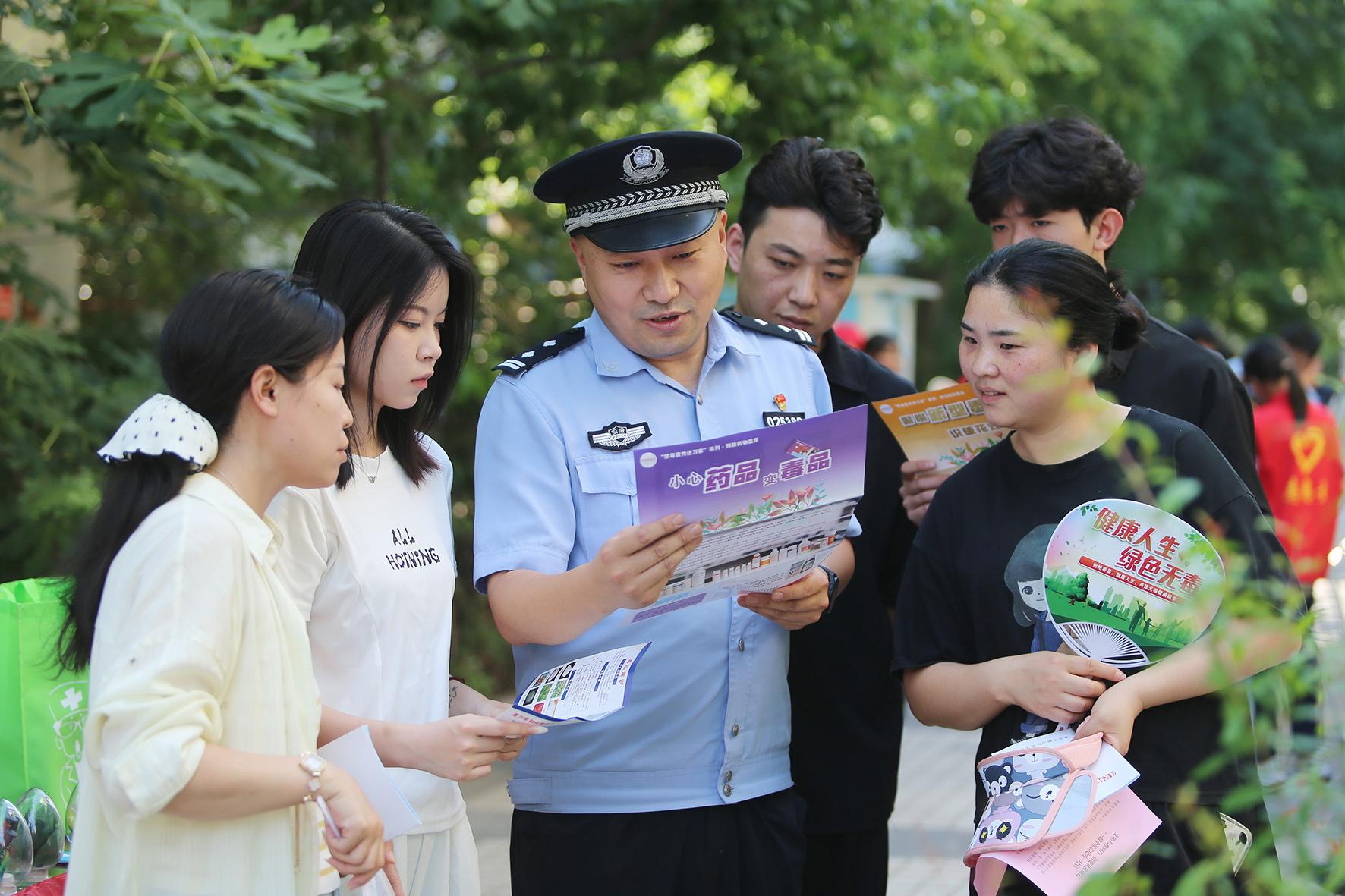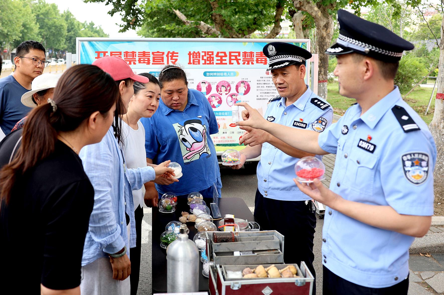 6月24日,河南省鄭州市公安局禁毒支隊民輔警在青年公園廣場利用仿真毒品模型為市民群眾講解毒品的危害性。