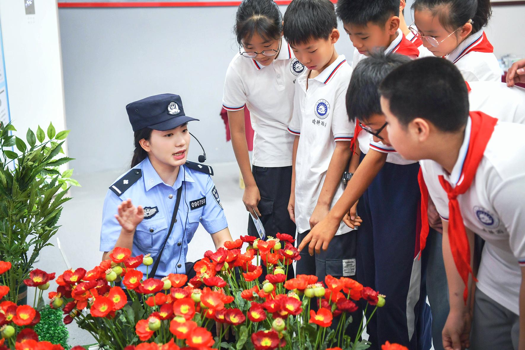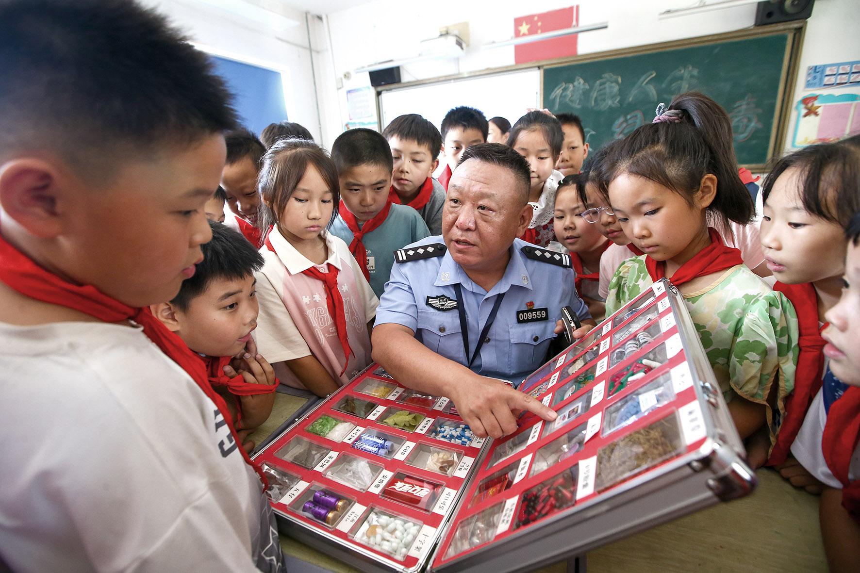 6月23日,安徽省涇縣公安局民警在涇縣毒品預防教育基地為學生講解禁毒知識。