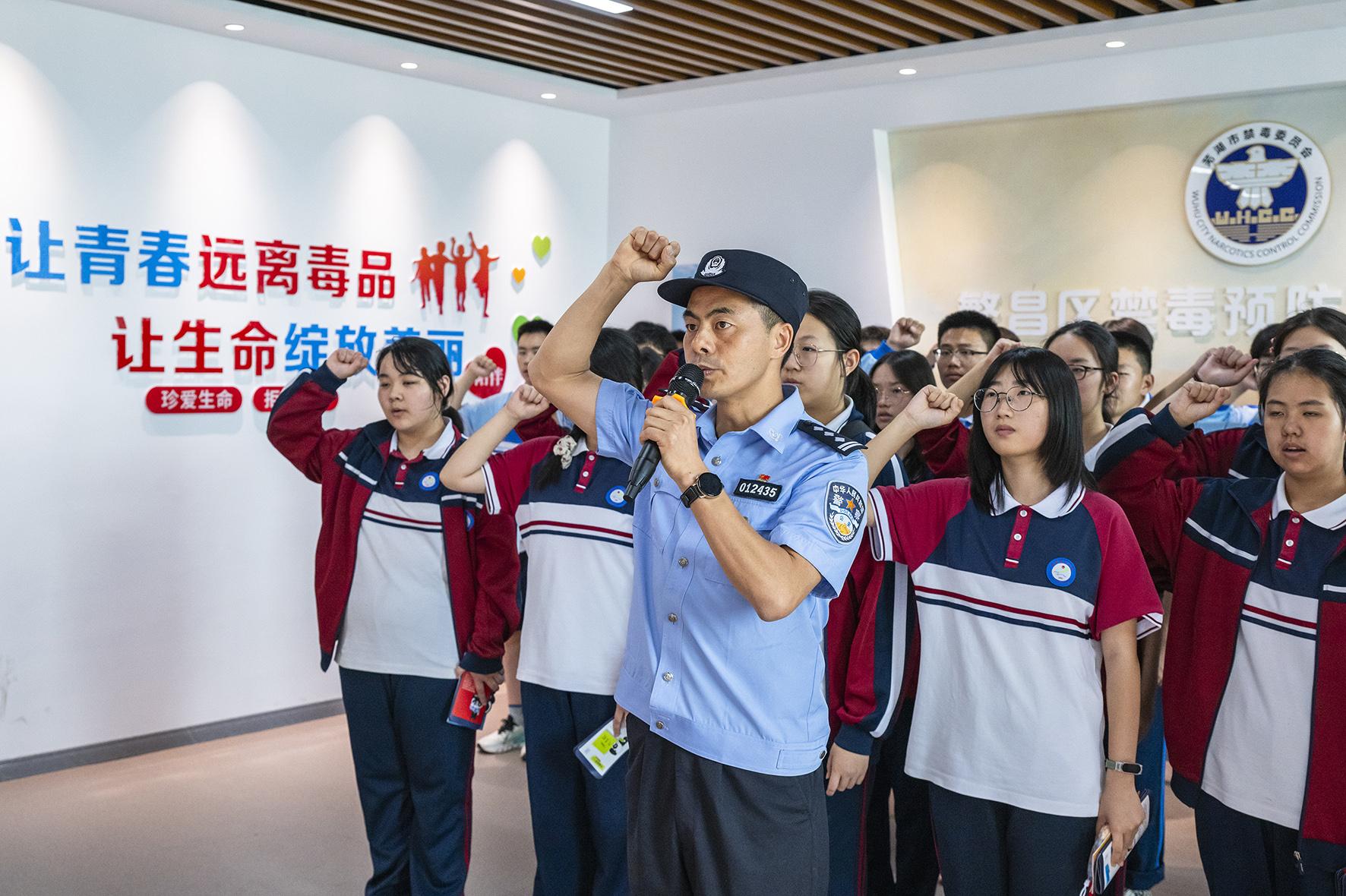 在第38個國際禁毒日來臨之際,6月24日,安徽省蕪湖市公安局繁昌分局民警帶領學生進行禁毒宣誓。