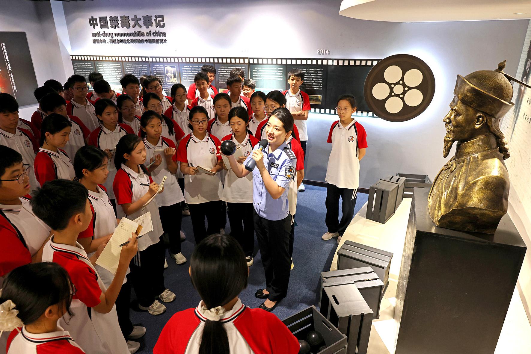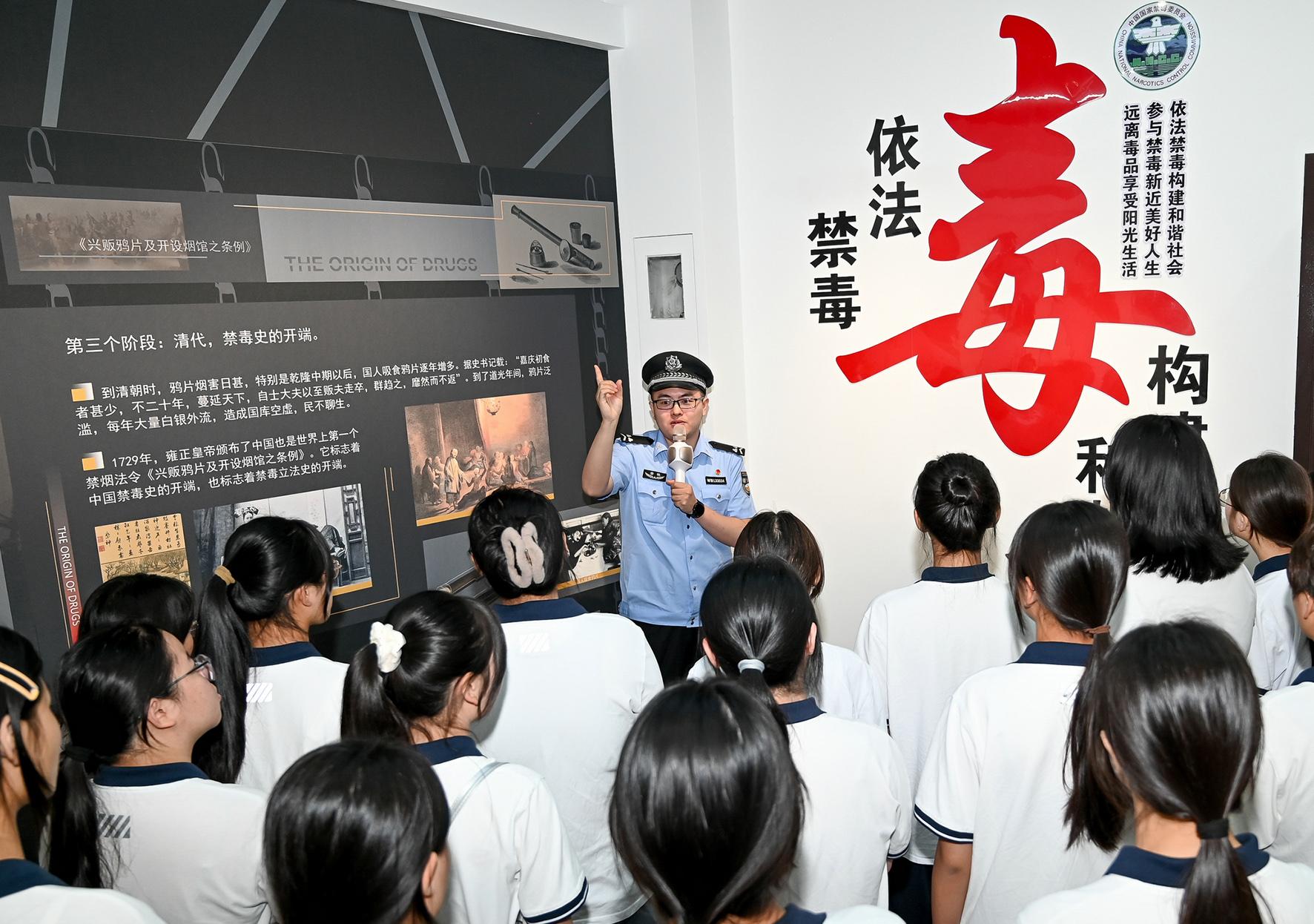 6月24日,在安徽省馬鞍山市和縣禁毒教育基地,講解員正在向和縣科技職業(yè)學校的學生講解禁毒知識。