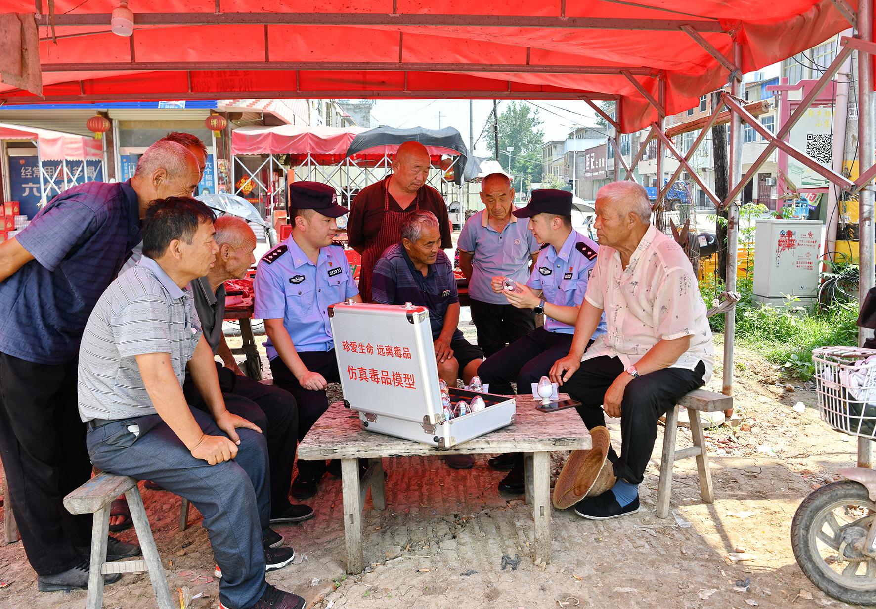 6月24日,安徽省阜南縣公安局禁毒大隊民警在段郢鄉(xiāng)張小集村頭,利用仿真毒品模型為村民們講解毒品的危害性。