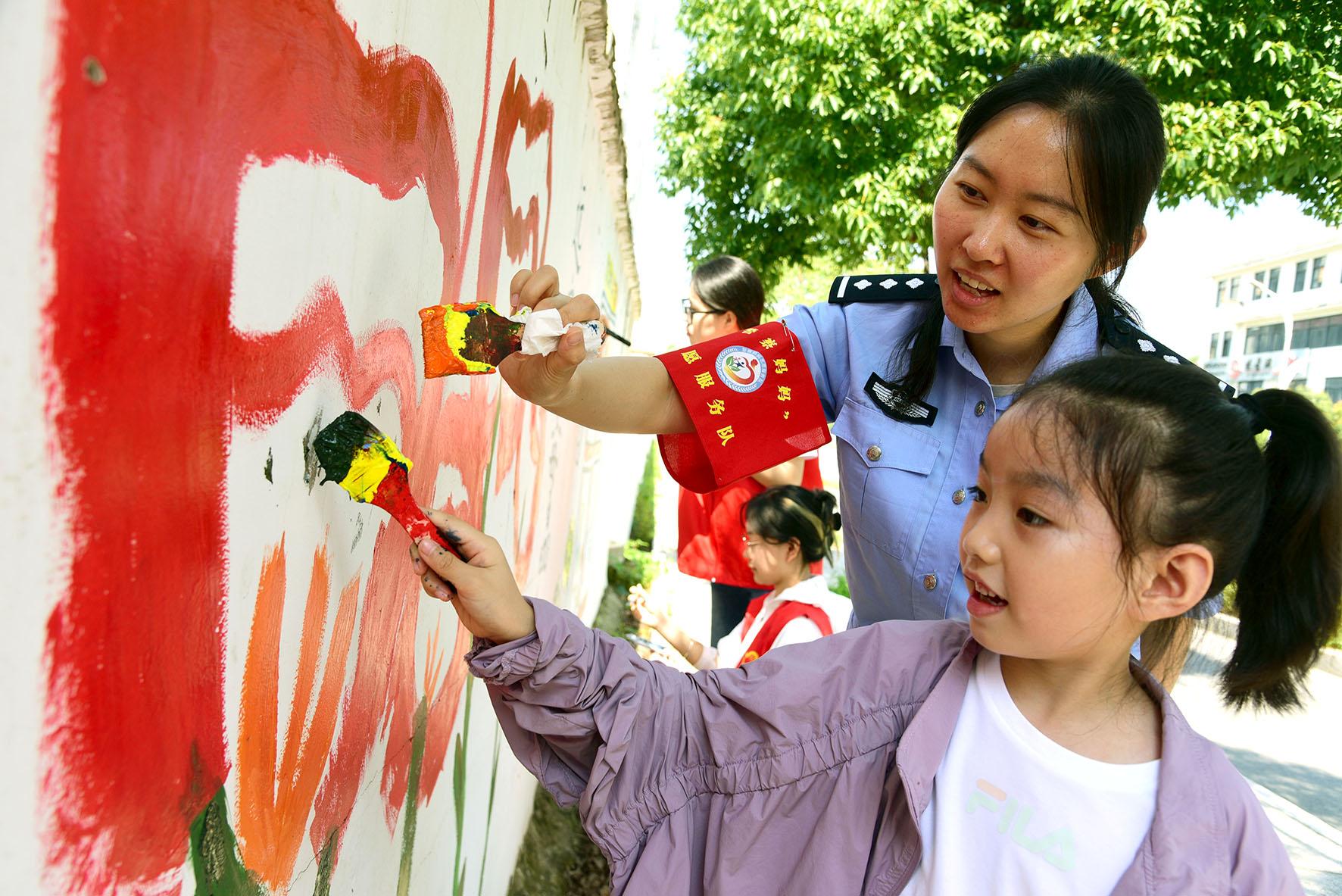 6月25日,在江蘇省鎮(zhèn)江市寶平社區(qū),江蘇大學志愿者、官塘派出所民警和小朋友一起描繪“禁毒文化墻”。