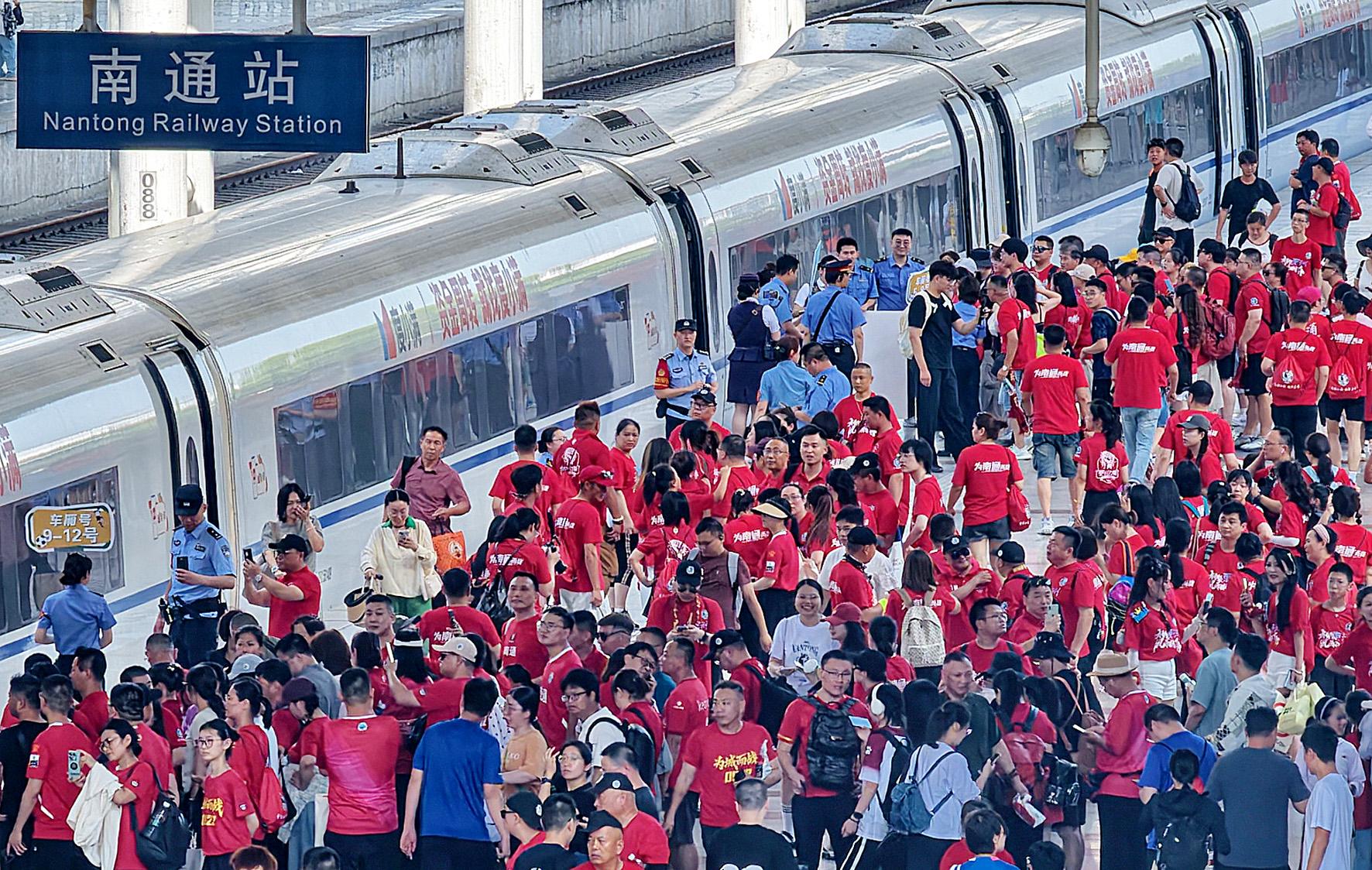 7月5日,為確保G9296次“球迷專列”運(yùn)行安全,南京鐵路公安處南通站派出所精心制訂安保工作方案和應(yīng)急預(yù)案,增派警力在南通火車站“球迷大巴”落客區(qū)、候車區(qū)、站臺等重點(diǎn)部位筑起守護(hù)防線,護(hù)航千余名球迷安全乘車看“蘇超”。