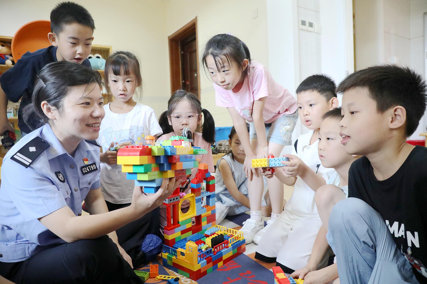 圖為7月10日,民警陪孩子們玩益智游戲。