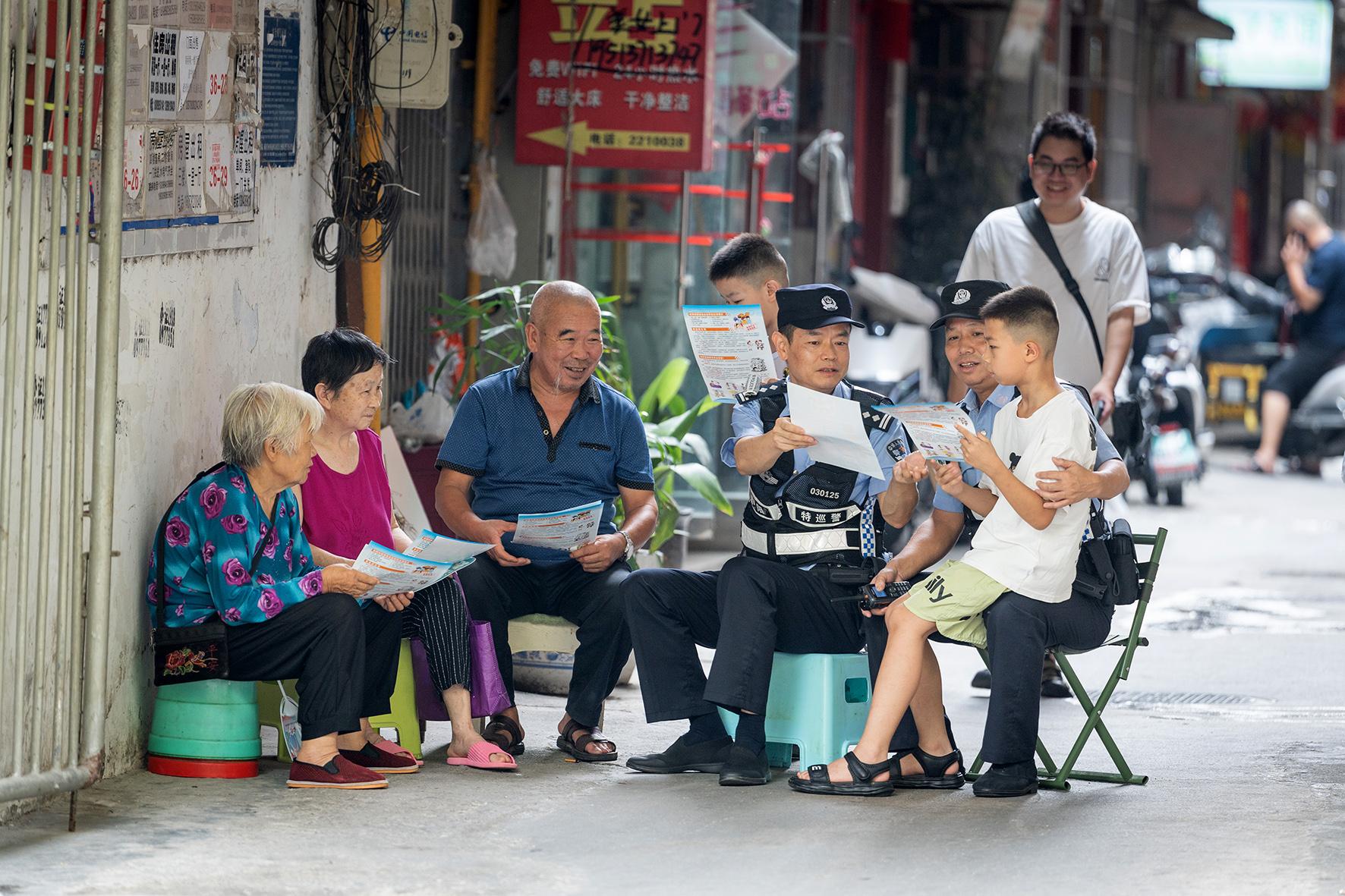 圖為7月16日,特巡警支隊(duì)巡邏一大隊(duì)的民警在涪城區(qū)南河五六社區(qū)向居民宣講反詐知識。