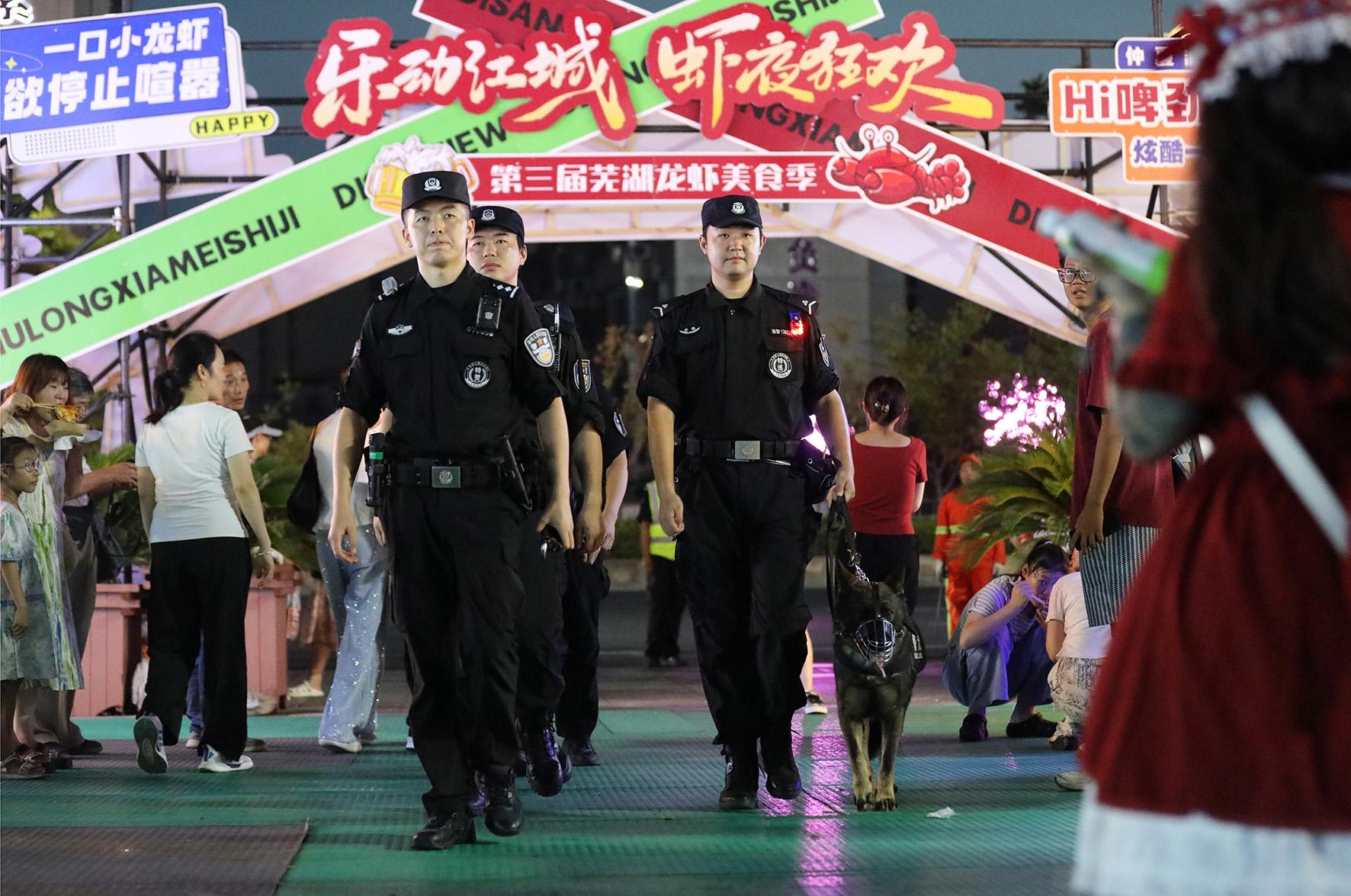 7月25日,安徽省蕪湖市公安局弋江分局特巡警大隊(duì)民輔警在蕪湖奧體中心“龍蝦美食季”夜市執(zhí)勤。