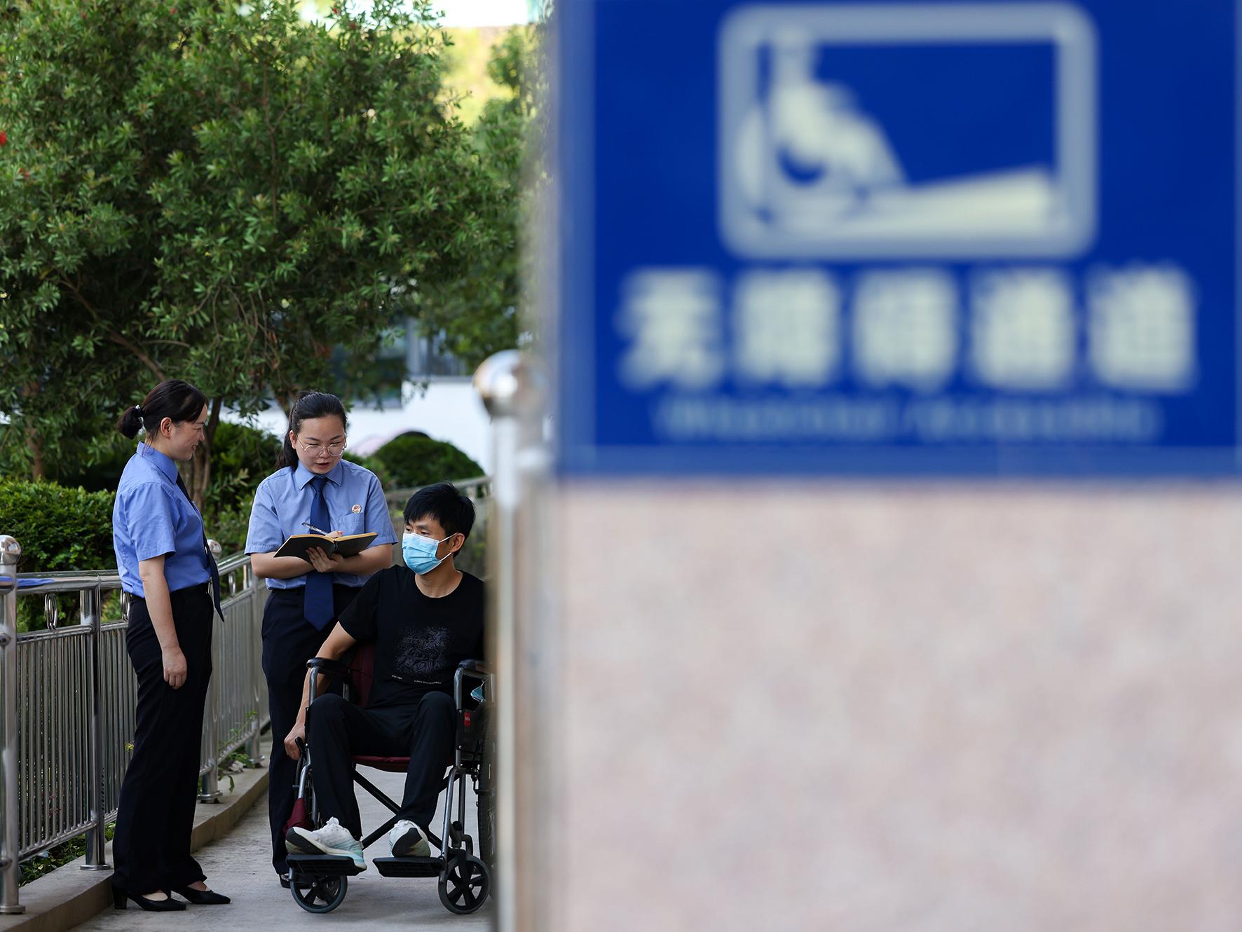 圖為7月29日,在貴州省銅仁市玉屏侗族自治縣行政服務(wù)中心,檢察干警向殘疾人士了解無(wú)障礙通道體驗(yàn)感受。