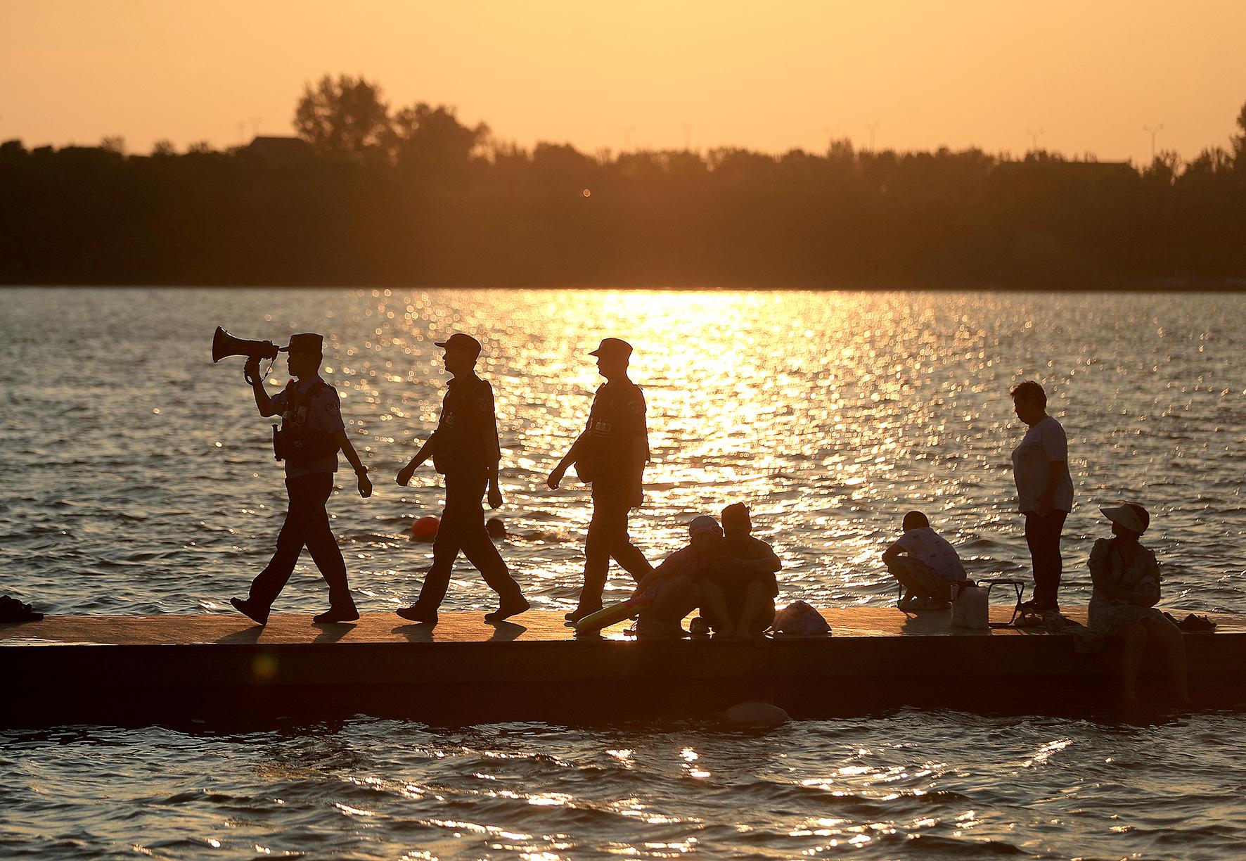“水深危險(xiǎn),請(qǐng)勿游泳!”7月28日傍晚,湖北省荊門(mén)市公安局巡特警支隊(duì)生態(tài)運(yùn)動(dòng)公園警務(wù)站民警,手持喇叭沿鳳凰湖岸勸離野泳群眾。