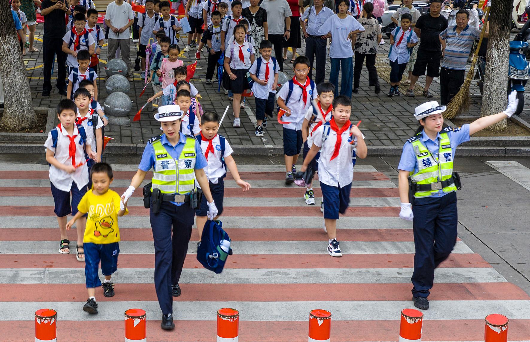 9月1日,安徽省廬江縣公安局交管大隊女子“護學崗”民輔警在城關小學門前維護交通秩序,護送孩子們平安進校園。