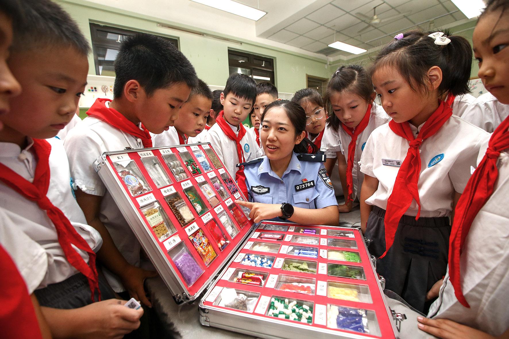 9月1日,山東省濟南市公安局市中分局民警來到愛都小學利用仿真毒品模型給學生講解禁毒常識。