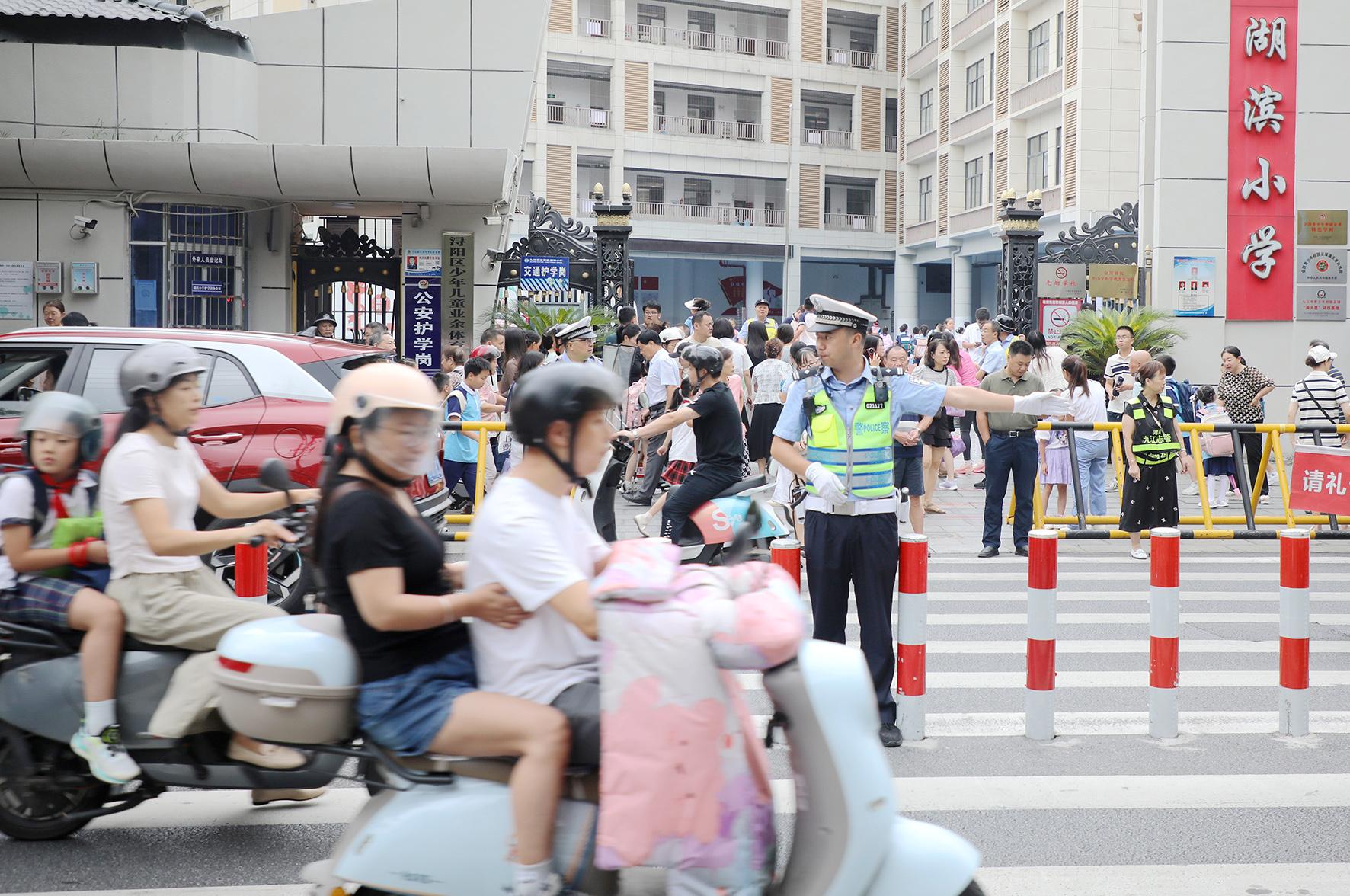 9月1日,江西省九江市公安局交管支隊潯陽大隊民輔警在轄區(qū)學校門口維護秩序。