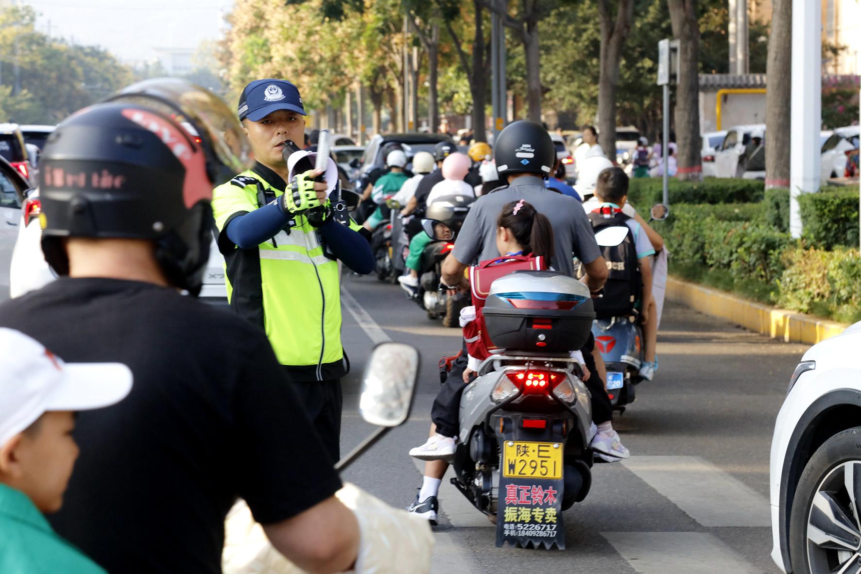 9月1日,陜西省渭南市公安局交警支隊臨渭大隊民警在渭南市實驗小學十字路口指揮疏導車輛。