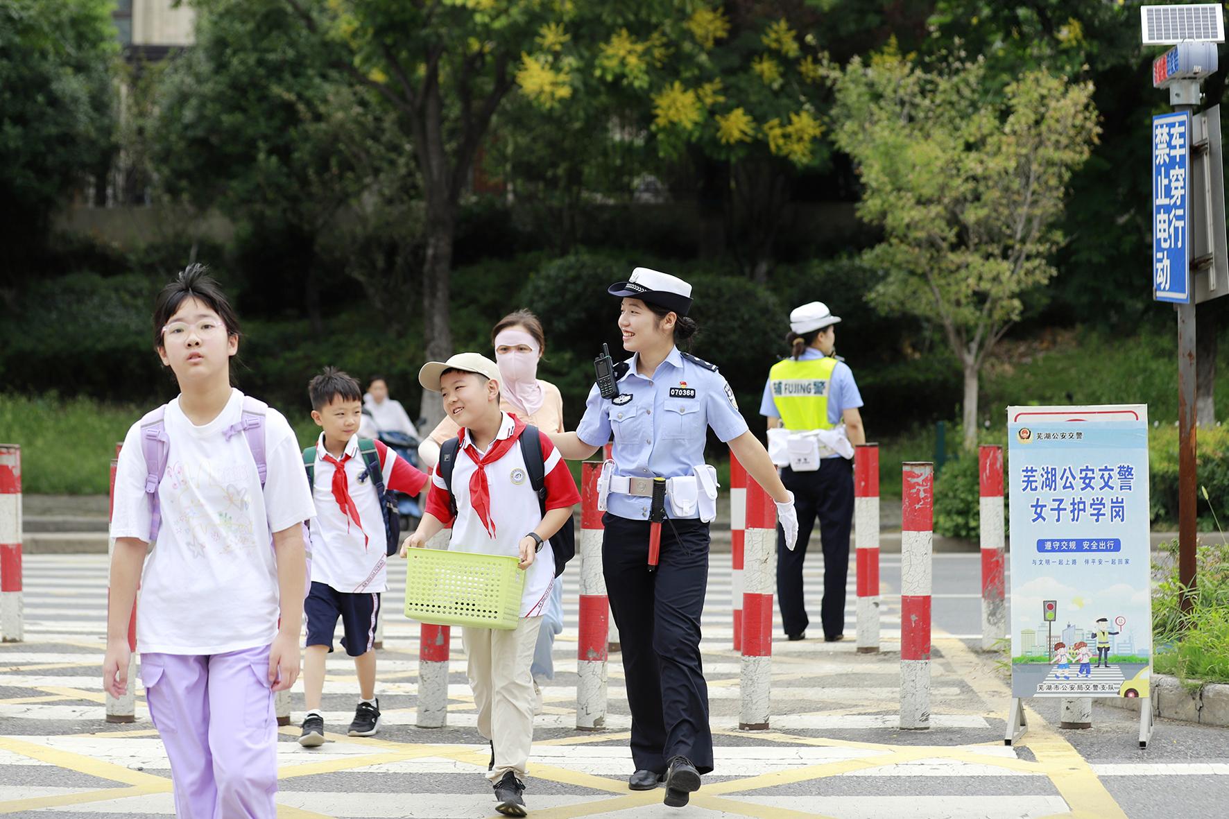 9月1日,安徽省蕪湖市公安局交警支隊弋江大隊女子護學崗民警,在安徽師范大學附屬小學(西校區(qū))護送小學生平安上學。