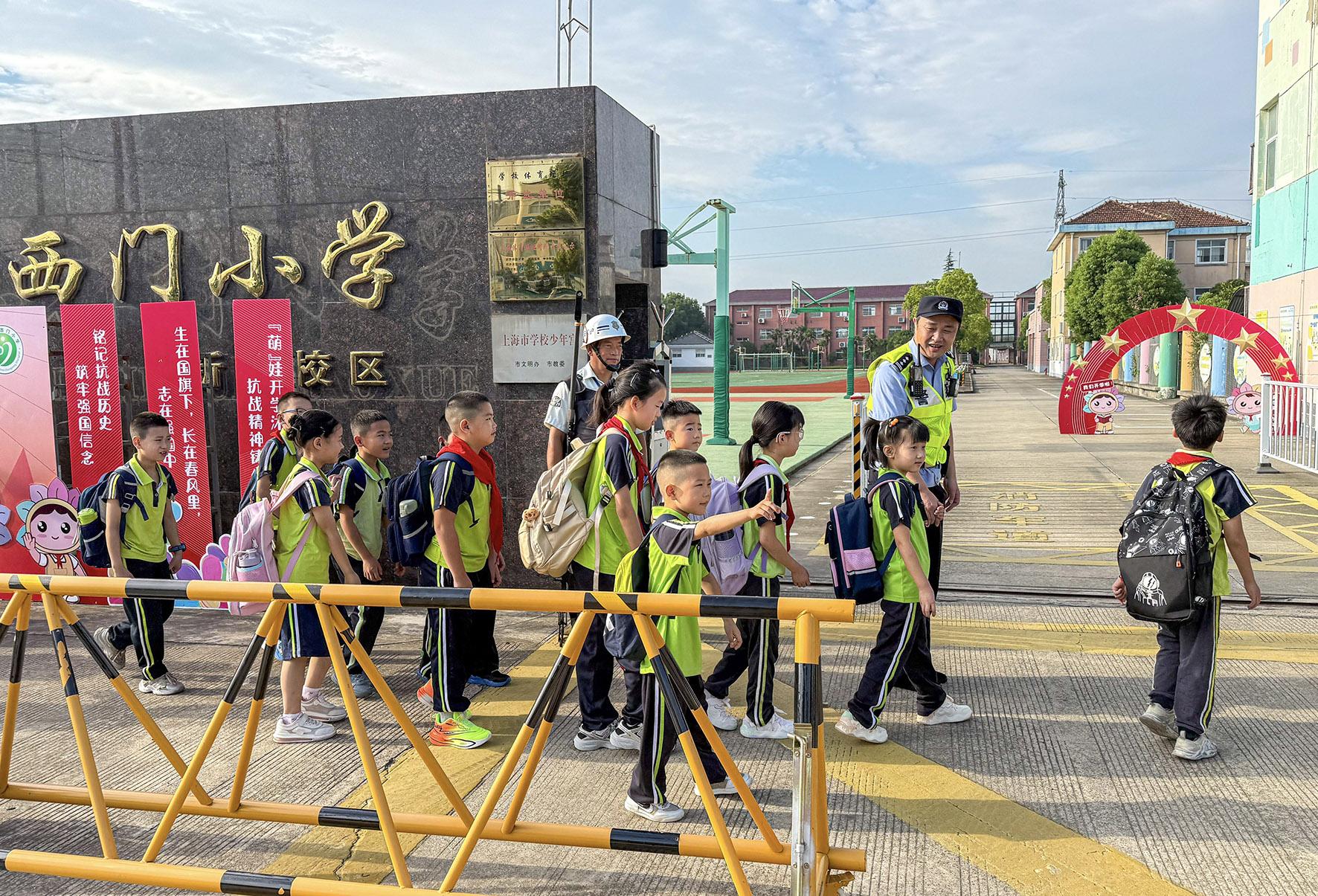 9月1日開學首日,上海市公安局崇明分局新村派出所民警開展護校安園工作。