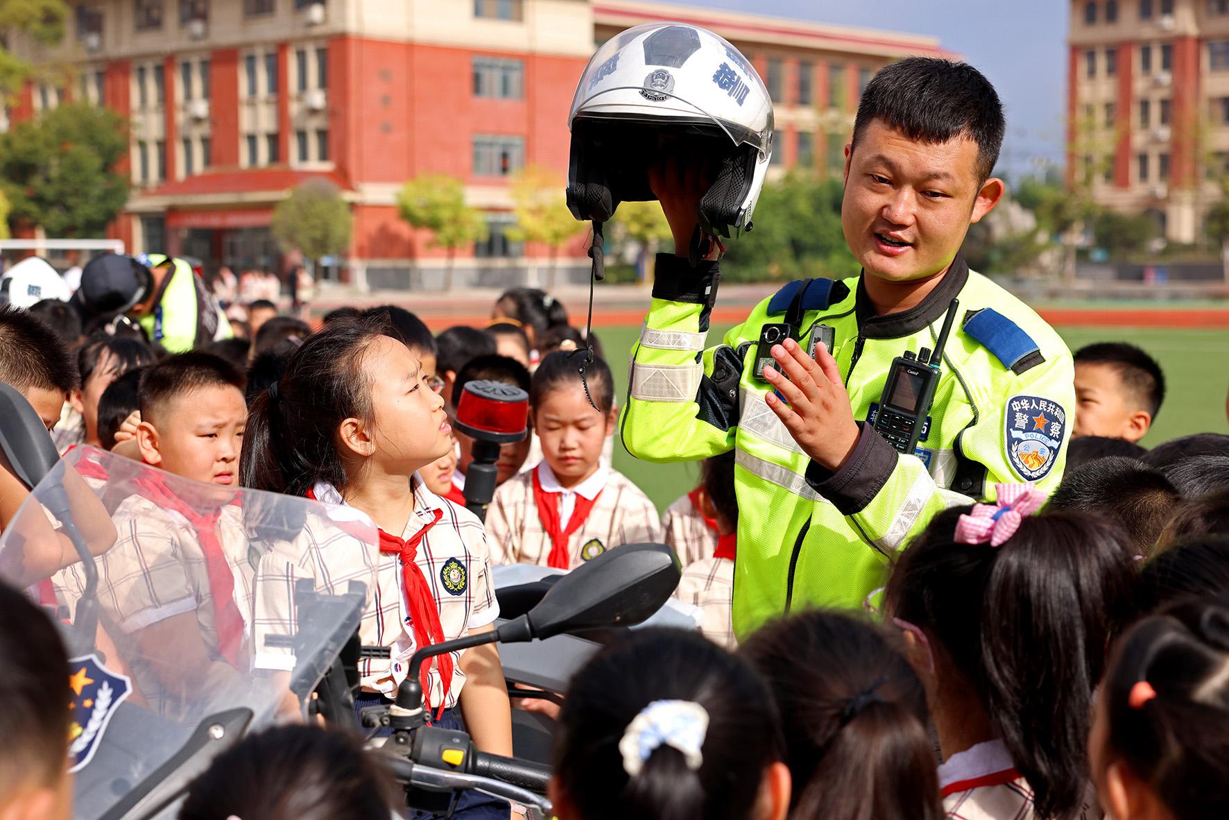 9月1日,山東省棗莊市公安局市中分局交通管理大隊鐵騎隊員在東湖小學向學生們普及交通安全知識。