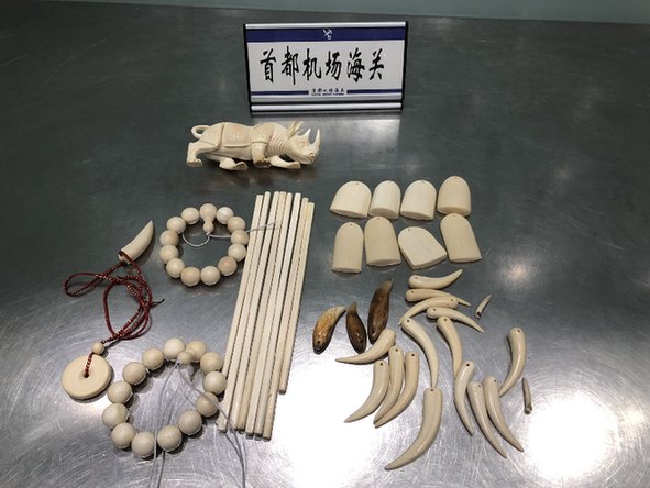 圖為北京海關(guān)查獲的象牙制品及穿山甲鱗片。北京海關(guān)供圖。