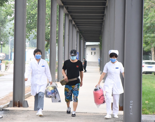 今天出院的老何戴著棒球帽,穿著黑色的短袖衫,綠底兒的沙灘褲,一身輕松。站在地壇醫(yī)院南門廣場,老何的口罩戴得嚴嚴實實,他說自己在新發(fā)地市場買點牛羊肉,口罩沒戴嚴實,“提醒咱們市民一定要做好防控,戴好口罩?!?/span>