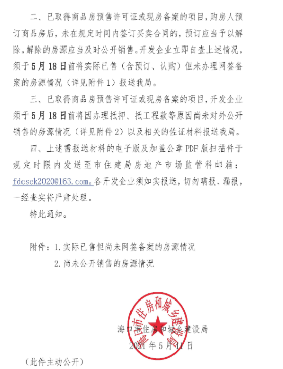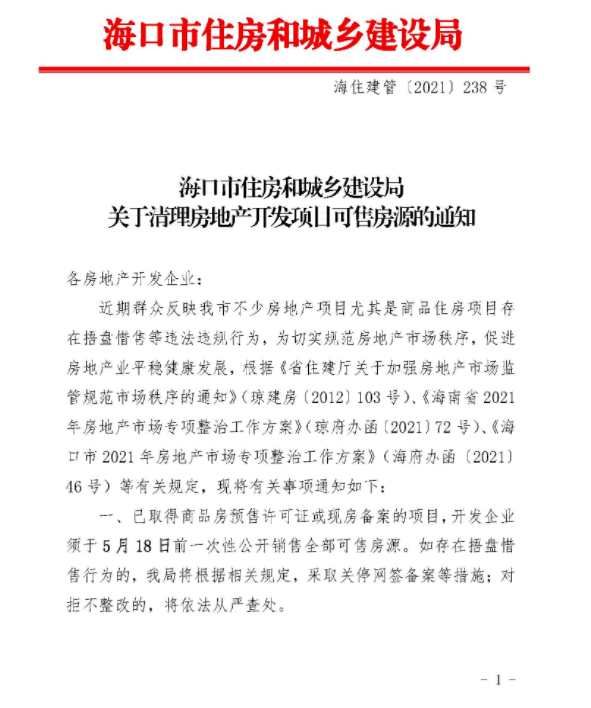 近日,海南省海口市住房和城鄉(xiāng)建設局發(fā)布《關(guān)于清理房地產(chǎn)開發(fā)項目可售房源的通知》。
