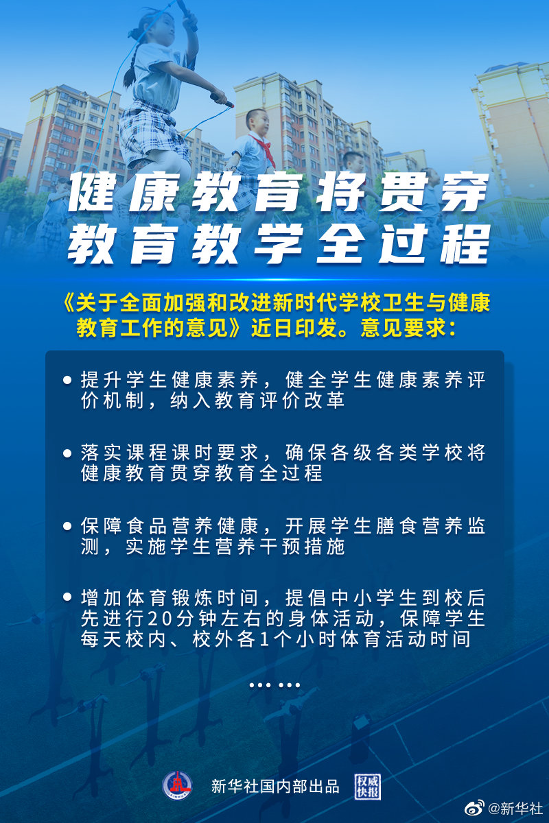 記者3日從教育部新聞發(fā)布會獲悉,《關(guān)于全面加強和改進(jìn)新時代學(xué)校衛(wèi)生與健康教育工作的意見》近日印發(fā)。意見要求,將健康教育與德育、智育、體育、美育、勞動教育相結(jié)合,融入教育教學(xué)、管理服務(wù)全過程。①提升學(xué)生健康素養(yǎng),健全學(xué)生健康素養(yǎng)評價機制,納入教育評價改革。②明確健康教育內(nèi)容。③落實課程課時要求,確保各級各類學(xué)校將健康教育貫穿教育全過程。④拓展健康教育渠道。⑤保障食品營養(yǎng)健康,開展學(xué)生膳食營養(yǎng)監(jiān)測,實施學(xué)生營養(yǎng)干預(yù)措施。⑥增加體育鍛煉時間,提倡中小學(xué)生到校后先進(jìn)行20分鐘左右的身體活動,保障學(xué)生每天校內(nèi)、校外各1個小時體育活動時間。⑦強化心理健康教育。⑧養(yǎng)成健康行為習(xí)慣。(記者胡浩,海報設(shè)計楊軼群)