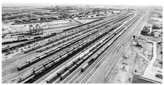 圖為近日內(nèi)蒙古二連浩特口岸鐵路貨場內(nèi),滿載貨物的中歐班列集裝箱宛如“鋼鐵駝隊”蓄勢待發(fā)。 本報通訊員 楊金燁 攝
