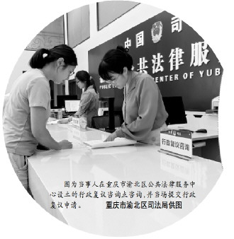 圖為當(dāng)事人在重慶市渝北區(qū)公共法律服務(wù)中心設(shè)立的行政復(fù)議咨詢(xún)點(diǎn)咨詢(xún),并當(dāng)場(chǎng)提交行政復(fù)議申請(qǐng)。