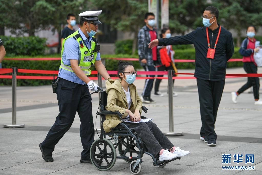 6月7日,交警幫助行動不便的考生進(jìn)入內(nèi)蒙古呼和浩特市第二中學(xué)(西校區(qū))考點(diǎn)。