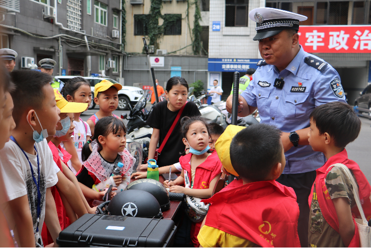 為做好暑期道路交通安全宣傳工作,增強未成年人的交通安全意識,7月14日上午,四川省綿陽市公安局交警支隊直屬一大隊組織本地報社的“小記者”們到大隊參觀、采訪?;顒又?,民警向“小記者”們介紹交警工作,講解交通安全知識,還為他們展示酒精測試儀、防暴盾牌、臂盾等執(zhí)法裝備,并進(jìn)行現(xiàn)場演示。圖為民警與“小記者”互動。