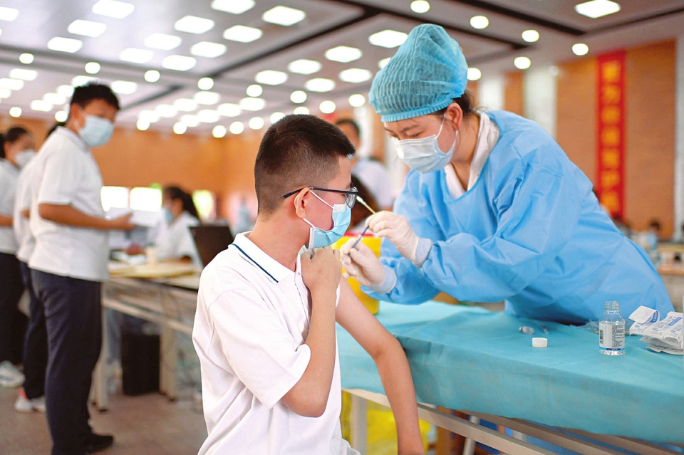 8月27日,太原師范學院附中,初二年級學生正在有序接種新冠疫苗。秋季開學在即,如何筑牢校園防疫網,是學校、老師、家長以及學生們都十分關心的問題。目前,太原市已經開始12歲至14歲未成年人接種新冠疫苗的工作,預計在開學期間,太原市該年齡段的疫苗接種工作將全部完成。(記者李兆民攝)