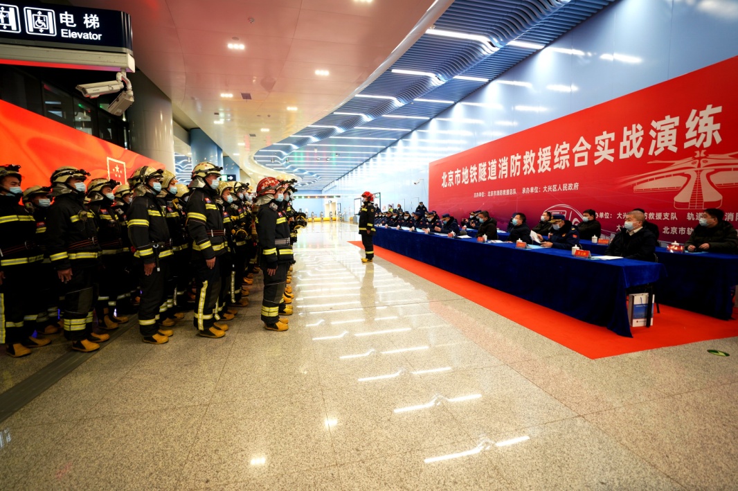為全力做好2022年春運(yùn)服務(wù)保障工作,防范化解重大安全風(fēng)險,聚焦“全災(zāi)種、大應(yīng)急”救援需要和地鐵隧道火災(zāi)滅火救援處置能力。1月21日凌晨,北京市在北京地鐵大興機(jī)場線大興新城地鐵站組織開展全要素地鐵隧道火災(zāi)滅火救援綜合實(shí)戰(zhàn)演練。演練模擬一列由大興新城地鐵站開往草橋站的地鐵因動力電機(jī)故障導(dǎo)致電氣線路起火燃燒,多節(jié)車廂起火,列車、隧道以及車站內(nèi)大量人員被困的情形。北京市消防救援總隊(duì)先后調(diào)集10個單位、52輛消防車、248名消防救援人員,以及市軌道運(yùn)營管理公司、公安、交通、環(huán)衛(wèi)、醫(yī)療、氣象、微型消防站等區(qū)級社會聯(lián)動力量200余人參演。