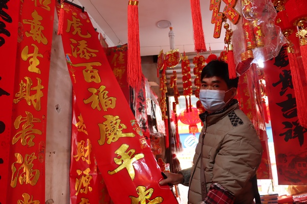 今年是虎年,許多帶虎字的春聯(lián)、中國結(jié)、福字備受歡迎。吳茂德是該縣夾石鎮(zhèn)太紅山村人,今天一大早就來到縣城,采購過年物品,而春聯(lián)是他采購清單里的第一個。經(jīng)過仔細挑選,他最終買了一副含虎字的對聯(lián)。