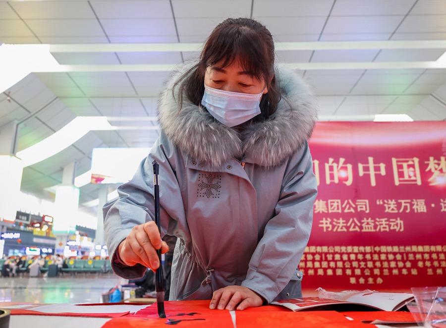 為實現(xiàn)“平安春運(yùn)、有序春運(yùn)、溫馨春運(yùn),讓旅客體驗更美好”的春運(yùn)目標(biāo),1月25日蘭州鐵路局在蘭州火車站、蘭州西站開展了以“我們的中國夢”為主題的“送萬?!みM(jìn)萬家”書法公益活動?;顒赢?dāng)天,甘肅省的20余名書法家、藝術(shù)家筆走龍蛇、揮毫潑墨,現(xiàn)場創(chuàng)作春聯(lián)和“福”字,為候車旅客送上新春的祝福。