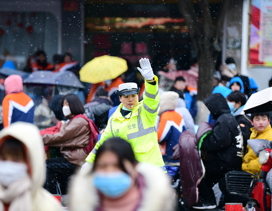 2月17日,安徽省阜南縣交警冒風雪中在城區(qū)第一小學周邊路段護送學生放學。連日來,該縣中小學校陸續(xù)開學,阜南縣公安局交管大隊啟動“護學崗”,疏導學校周邊交通秩序,確保道路暢通和師生上下學出行安全。