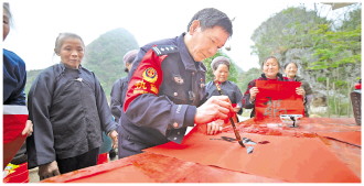 圖為李軍與村民一起寫福字過新年。 程睿哲 攝