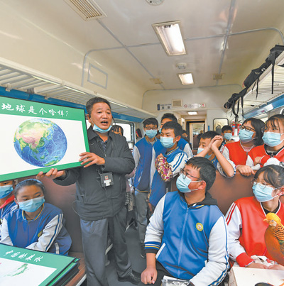 在由四川廣元開往陜西寶雞的6064次“秦嶺小慢車”上,一名教師在為沿線通勤的學(xué)生們公益授課。唐振江攝(影像中國)