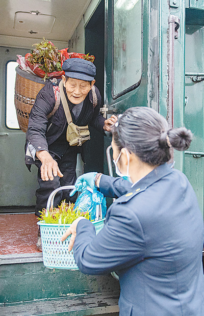 在位于湖南懷化的谷達(dá)坡站,乘務(wù)員為乘客遞蔬菜。新華社記者 陳思汗攝