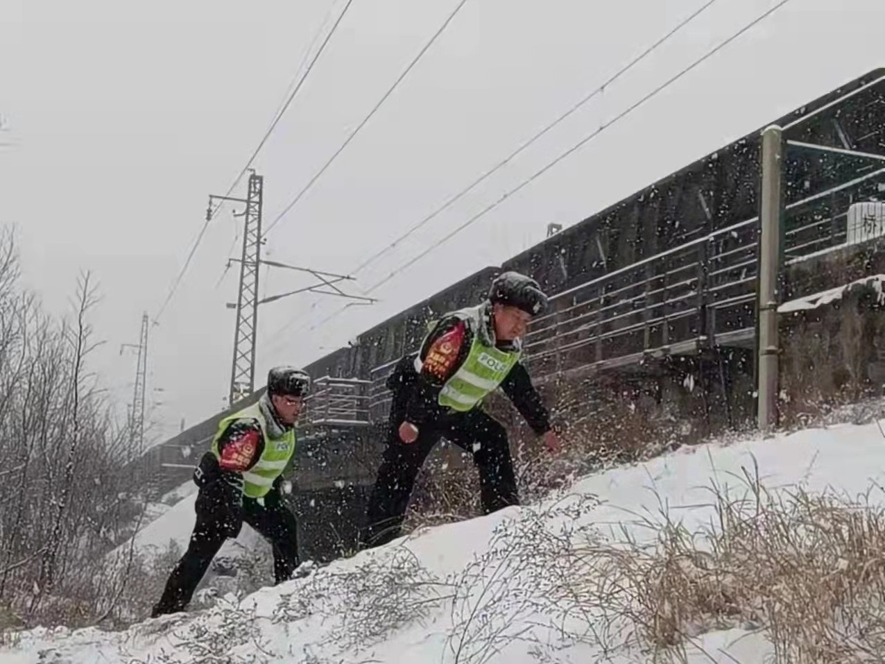 為積極應對冰雪天氣,確保旅客平安出行,大同鐵路警方全警奮戰(zhàn)在鐵路安全保障的第一線,成為雪景中一道靚麗風“警”線。圖為民警對線路重點區(qū)段、重點部位巡邏檢查。 東海 攝