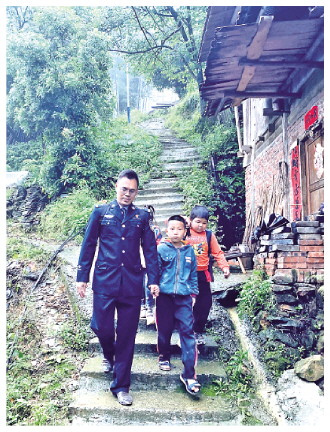 上圖 何峰為孩子們補課后,翻山越嶺送他們回家。