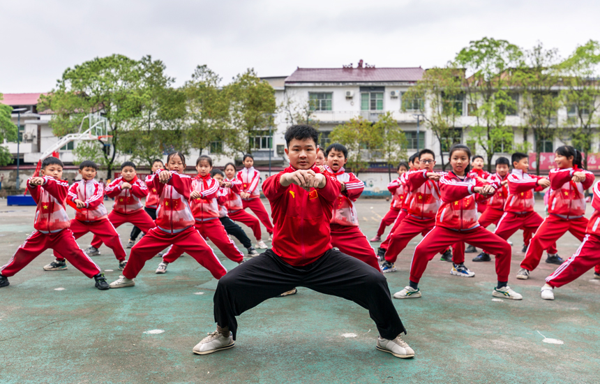 3月27日,上栗縣雞冠山中心小學(xué)武術(shù)社團(tuán)學(xué)生,正在教師帶領(lǐng)下開展武術(shù)訓(xùn)練。楊娟攝
