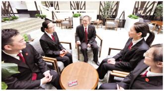 圖為殷傳茂(左三)組織合議庭及法官助理討論案件。 大連市中級人民法院供圖