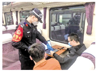 圖② 王旭明在車廂查驗(yàn)旅客身份信息。