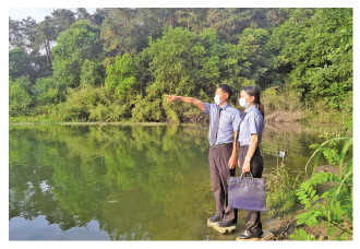 圖② 梁宏偉(左)與同事在淮河支流岸邊研討案件取證問(wèn)題。